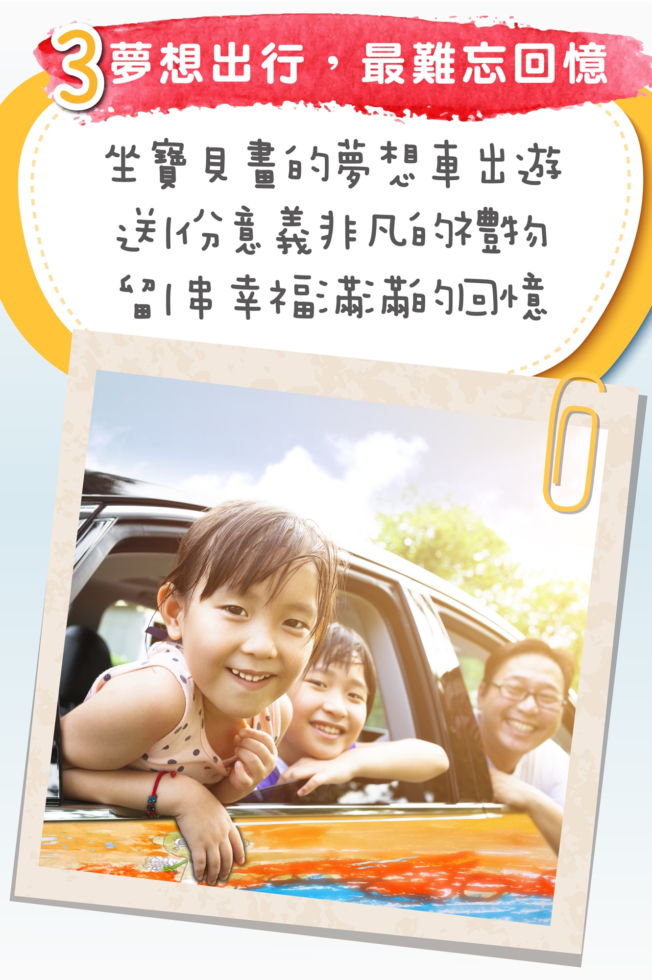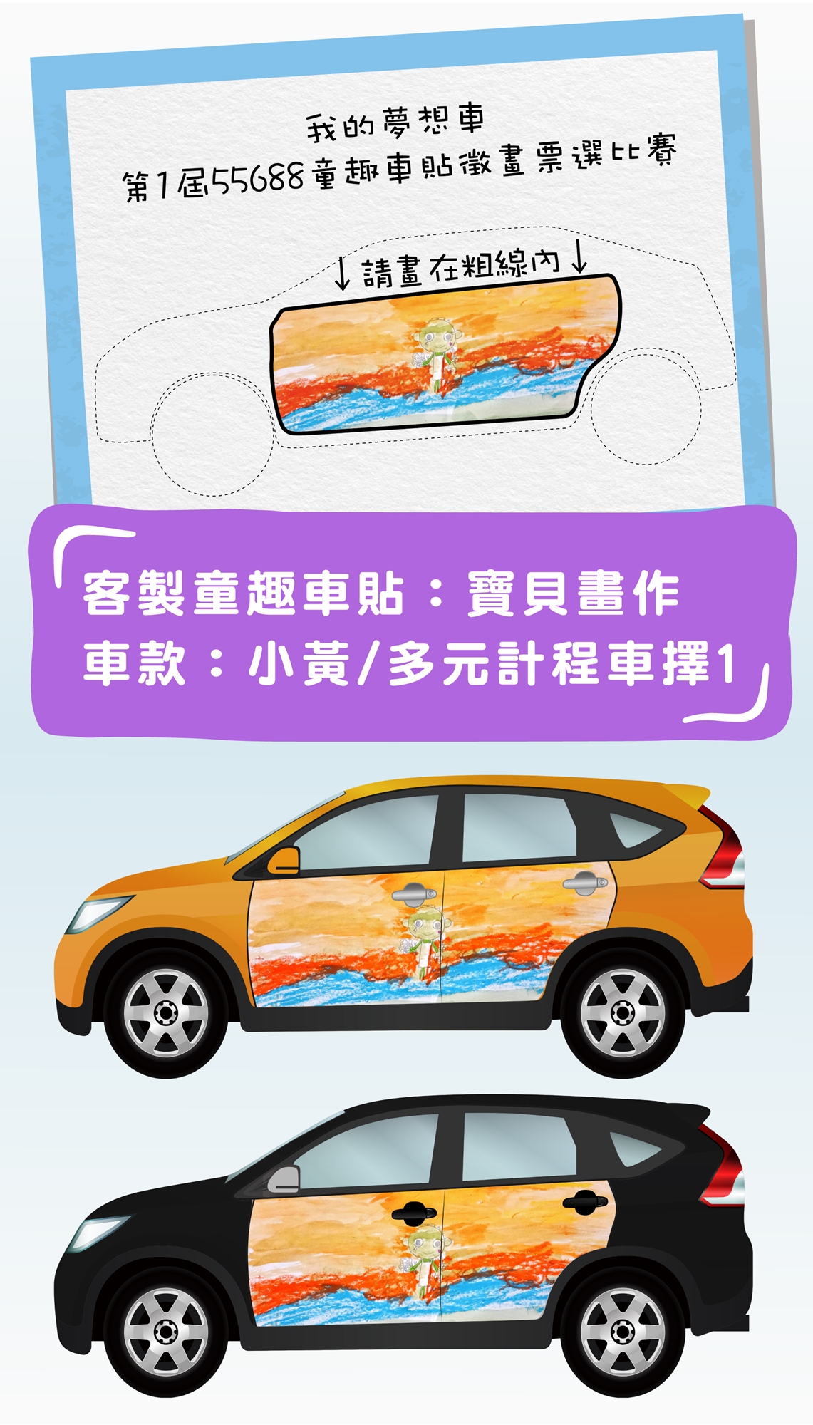 - 獲獎作品將印成客製童趣車貼,供獲獎者在 04/04(二)09:00~11:00於指定地點搭乘,並享有單趟車資免費的客制行程服務(上下車地點限雙北市,用車1 小時內)。