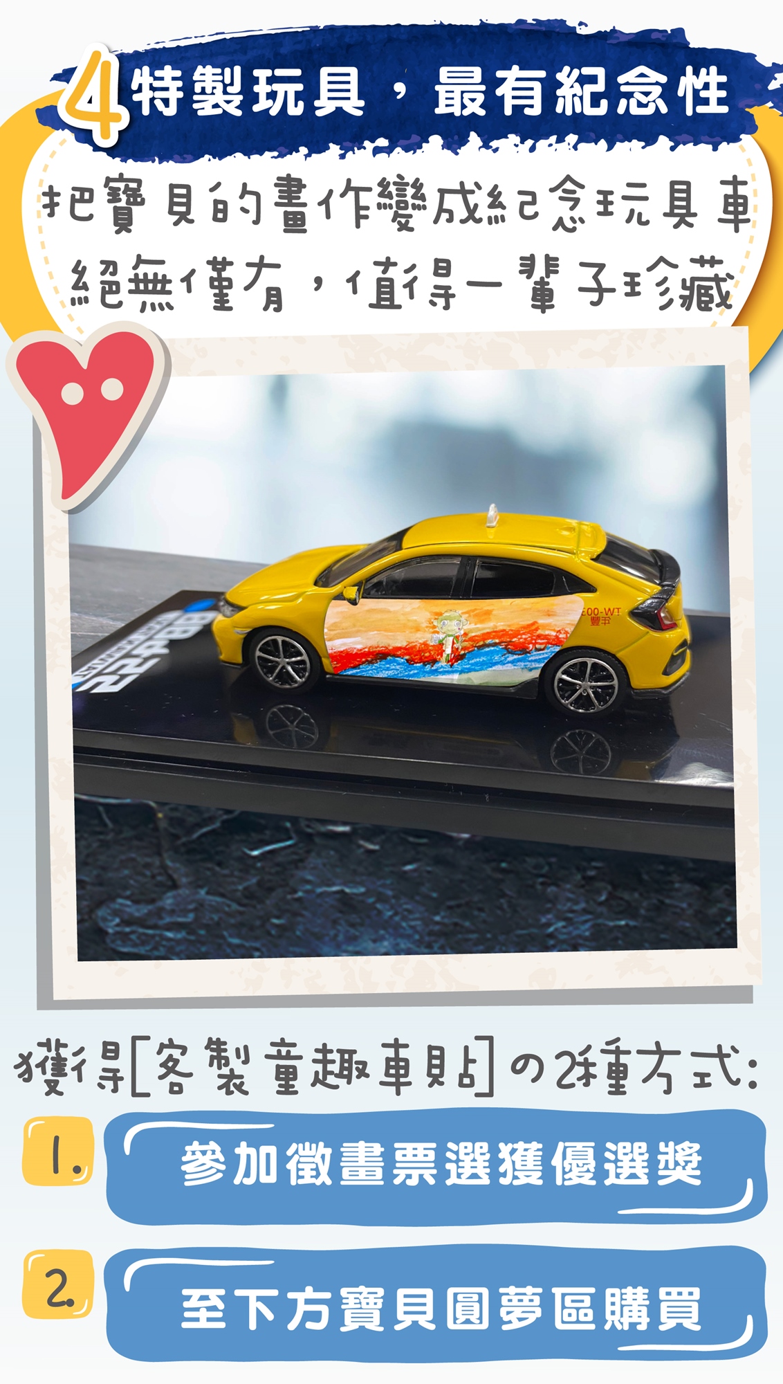 - 另於活動結束後 2 個月,獲得特製紀念玩具車乙輛,將作品永久保存珍藏。