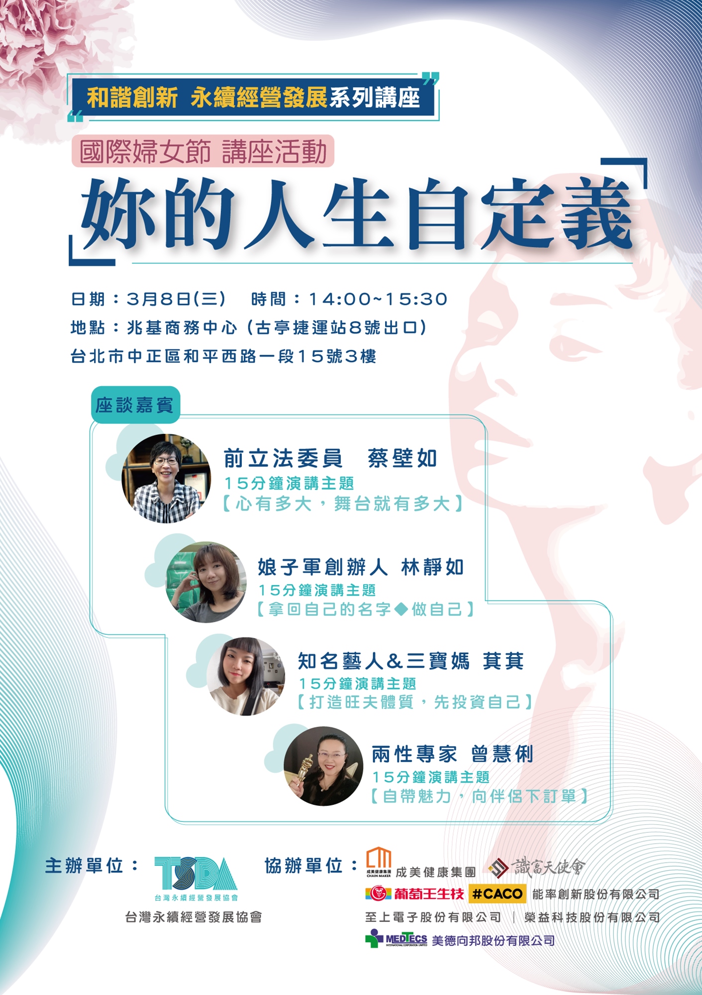 隨著時代進步女性意識抬頭,女性是個多元的角色,同時扮演母親、妻子、女兒與媳婦 等角色。女性的特質既可愛又感性,努力在人生的道路上扮演好每個角色被賦予的期 待。我們也常被鼓勵愛自己、做自己、掌握人生的自主權,現代社會也友善地邀請女人 們活出自己想要的樣子,拒絕那些刻板印象,爭取我們想挑戰的機會以及想追求的成 就。 「肯定自己」、「愛自己」彷彿是女性一生在找尋的答案,透過今天的座談分享,帶妳 一步步找回勇敢的女力天賦,妳的人生自定義!