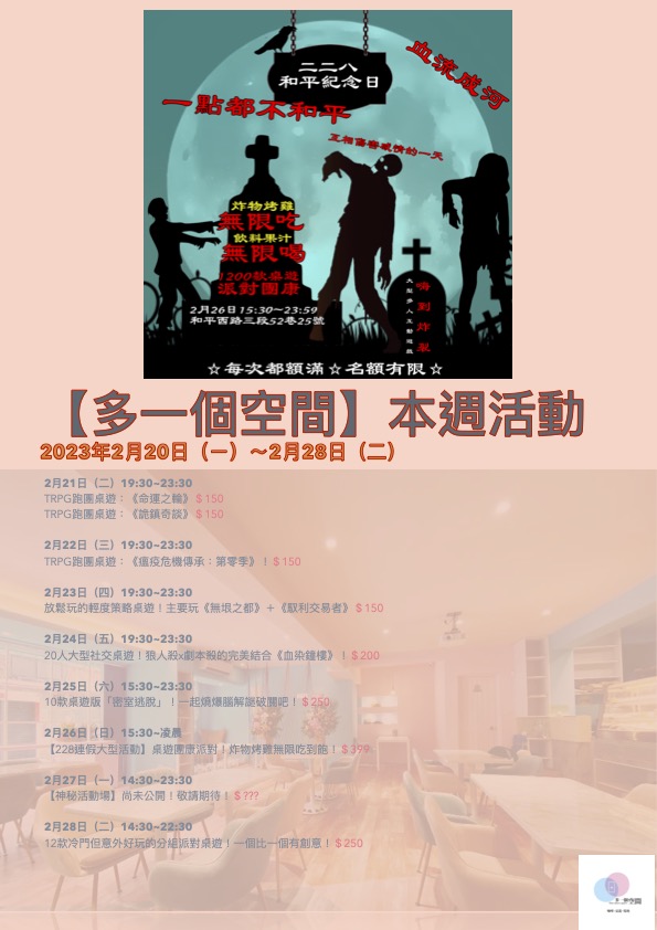 「多一個空間」由【多多看電影】的部落客-多多 所創立,一個致力於舉辦各種娛樂活動的場地,是一家複合式桌遊咖啡店,座落於龍山寺捷運站3號出口,視覺裝潢以馬卡龍粉與湖水藍為主要色調,與附近巷弄的古宅呈現極大的跳躍反差。