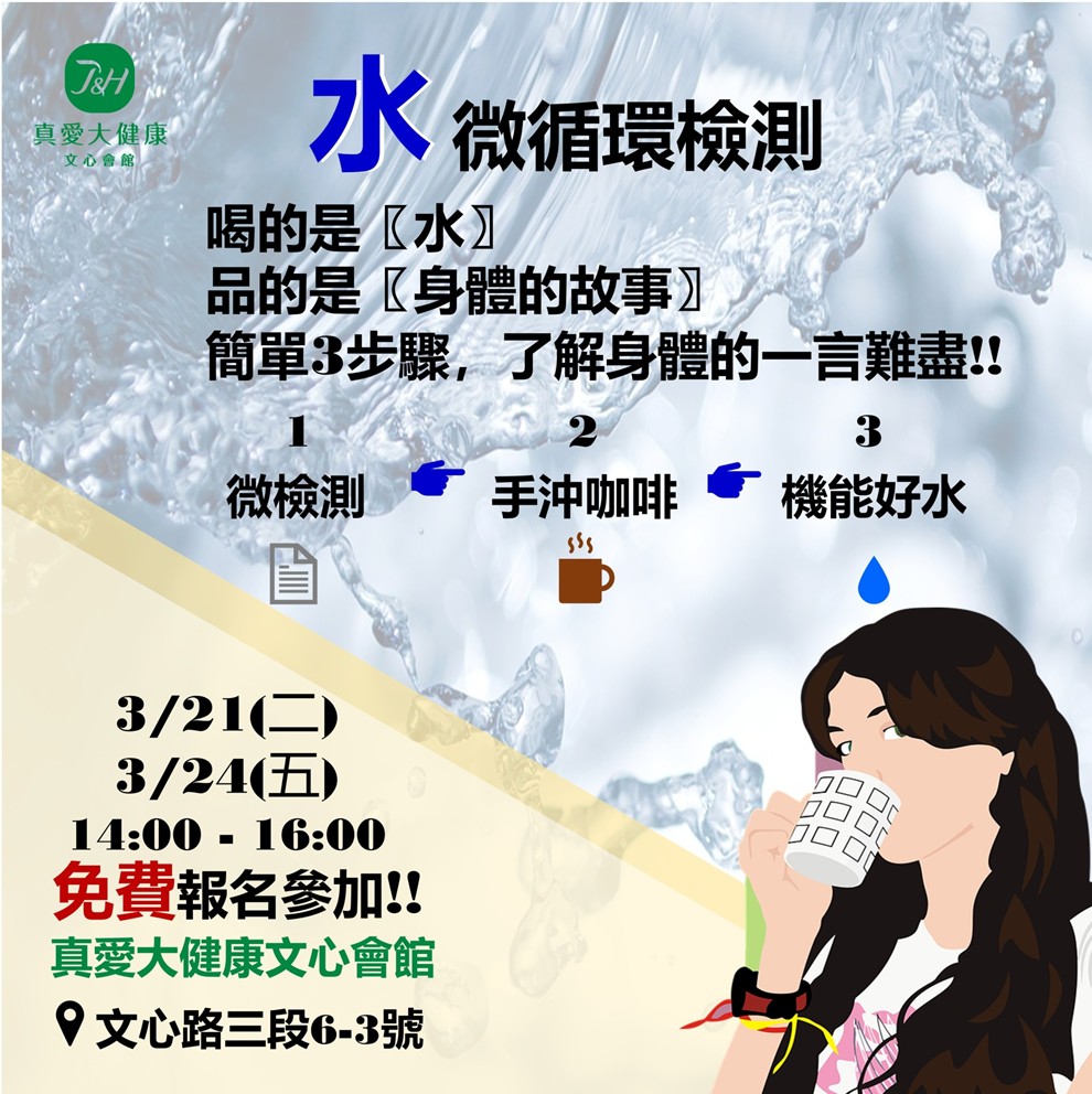 每場次僅供8位來賓,簡單3步驟約20分鐘時間,瞭解您喝的水對於您身體的影響!