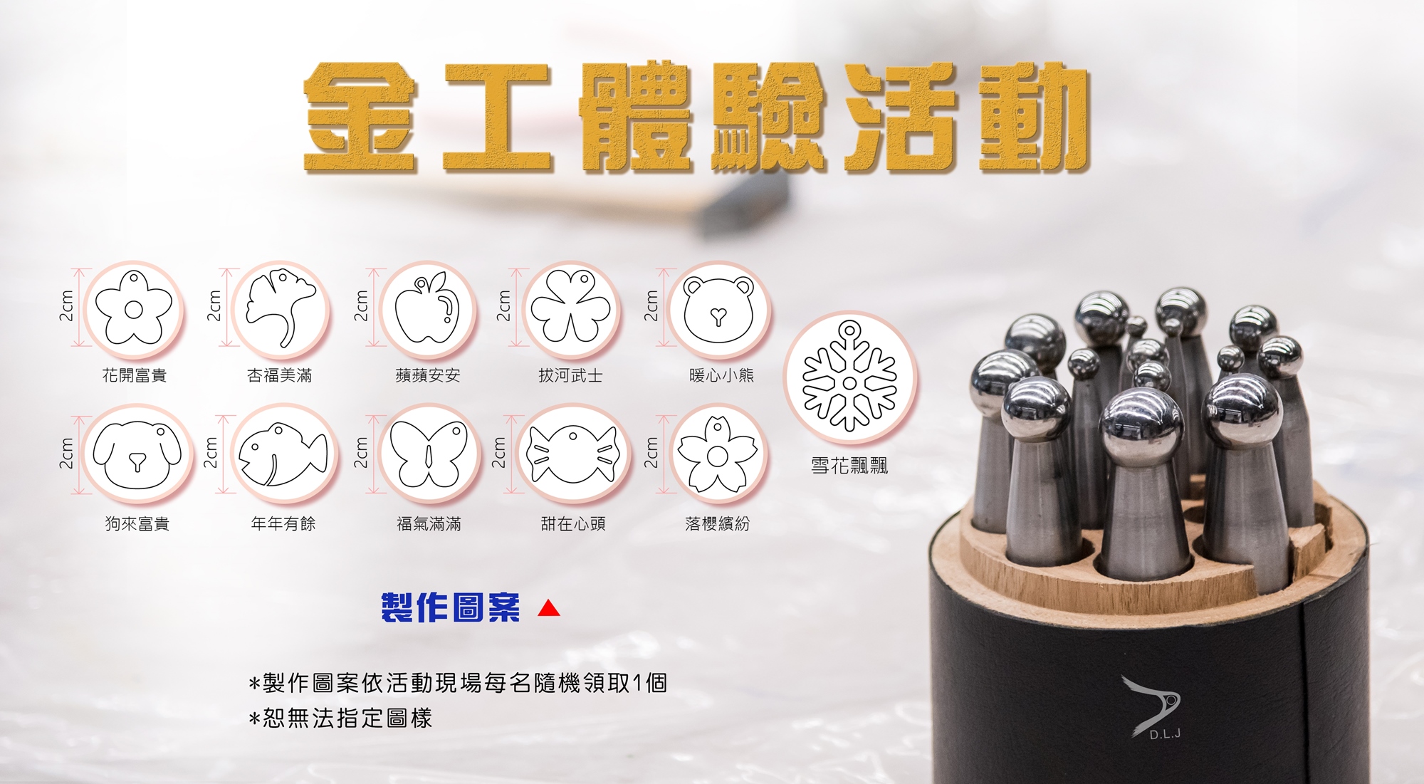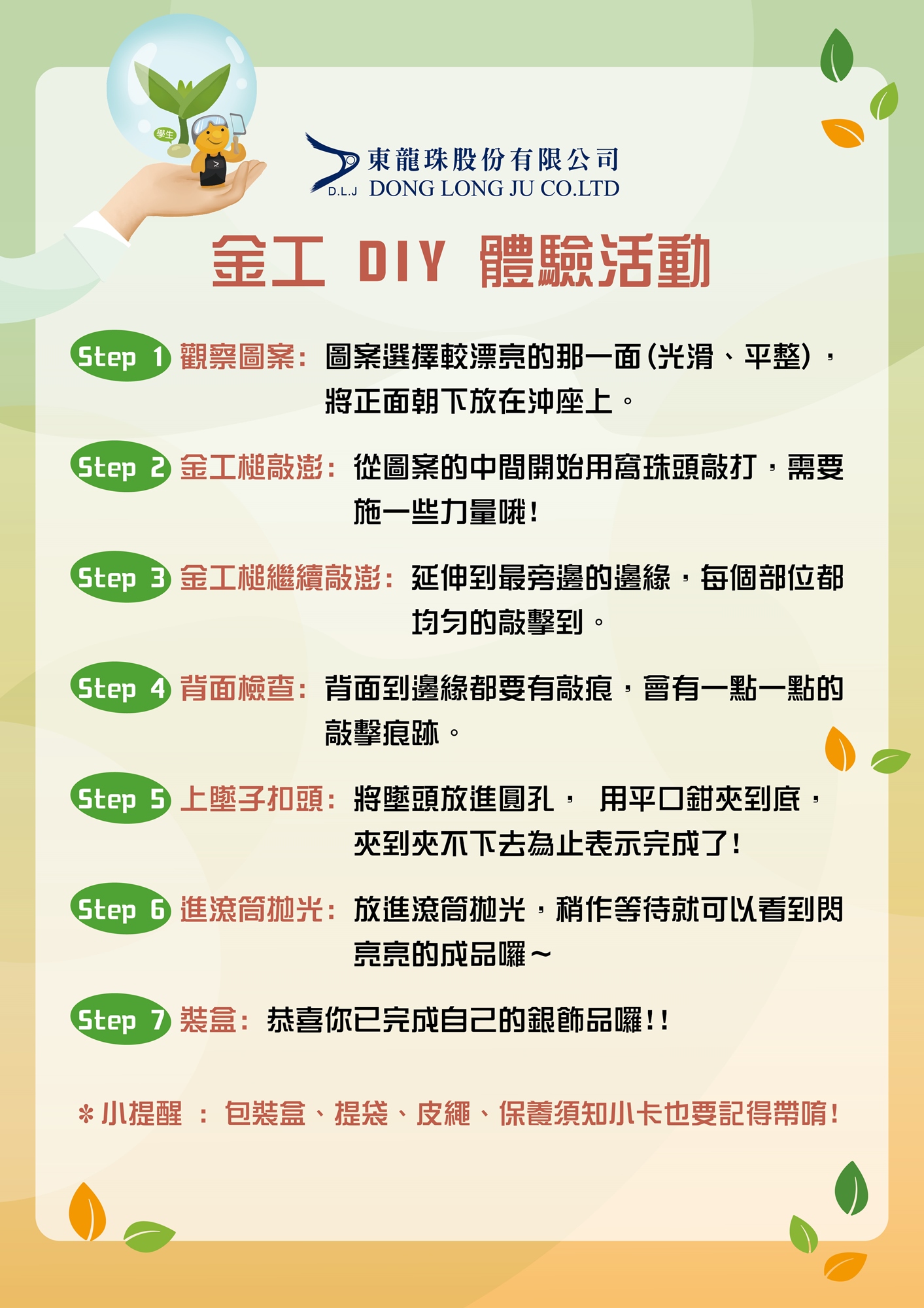 請於活動開始15分鐘前展位報到→領取材料包→準時開始上課→工具介紹→開始敲打→扣上扣頭→拋光→完成!