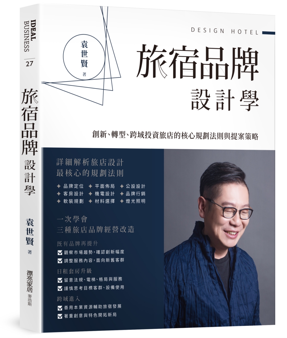 《旅宿品牌設計學》作者呈境設計創辦人─袁世賢,操刀過無數知名飯店品牌,包含煙波飯店台南館、太魯閣沁海館、宜蘭花時間傳藝以及海霸王集團旗下的城市商旅、德立莊。