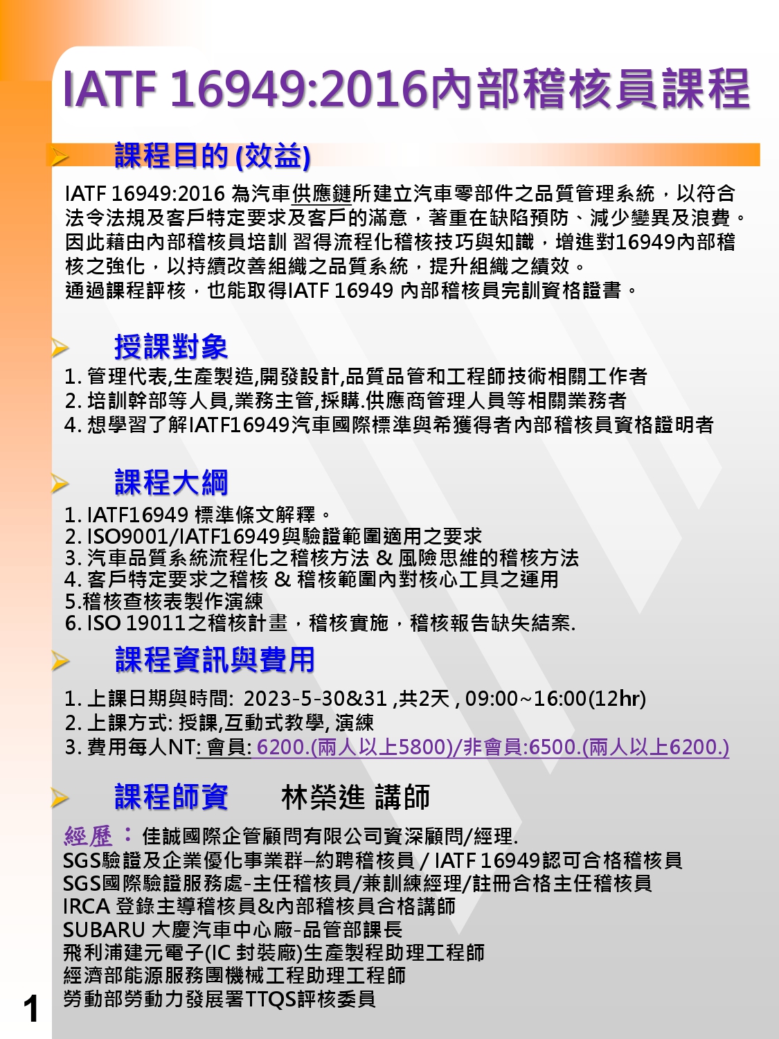 IATF 16949:2016 為汽車供應鏈所建立汽車零部件之品質管理系統,以符合 法令法規及客戶特定要求及客戶的滿意,著重在缺陷預防、減少變異及浪費。 因此藉由內部稽核員培訓 習得流程化稽核技巧與知識,增進對16949內部稽 核之強化,以持續改善組織之品質系統,提升組織之績效。 通過課程評核,也能取得IATF 16949 內部稽核員完訓資格證書。