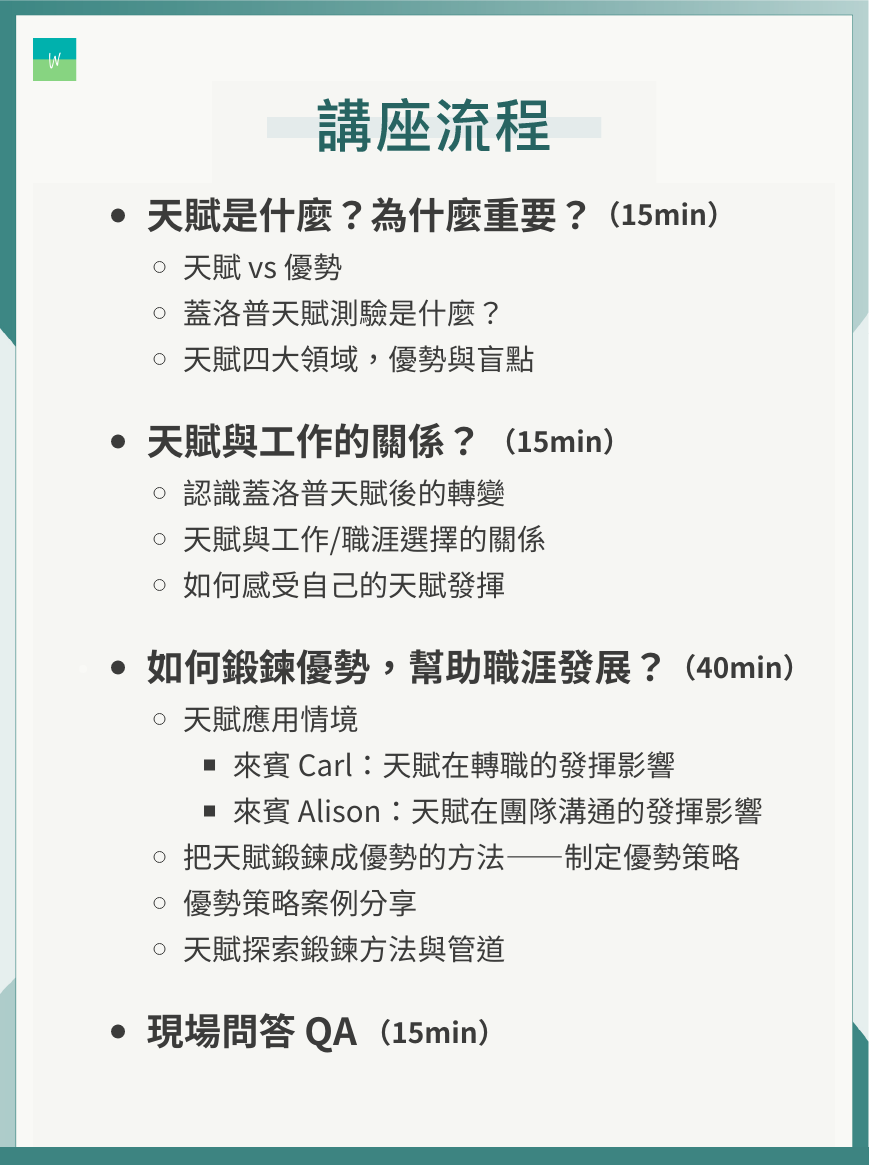 線上直播講座,整理優勢職涯教練們最常遇到的諮詢問題,更有 QA 問答環節,歡迎直接與三位蓋洛普國際認證優勢教練(Grace、Alison、Carl)互動,解惑你的疑問。