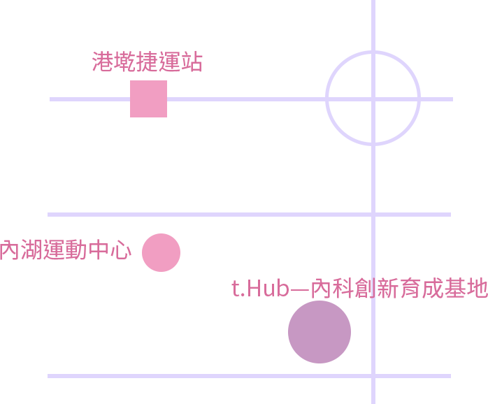 - 文湖線(棕色線)港墘站 2 號出口,沿內湖高工圍牆行至港墘路與洲子街口,即可看見t.Hub。