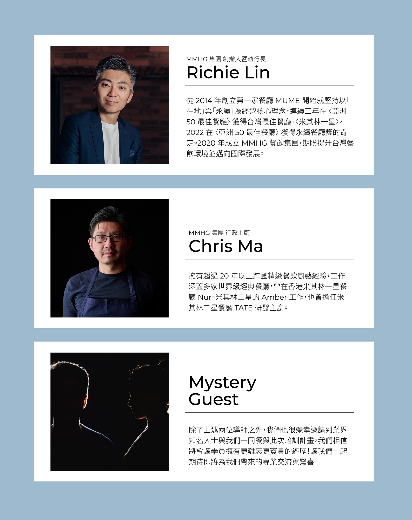 MMHG 的營運總監,同時也是 2023 BEYOND TABLE 發起人之一。曾在多國工作的她擁有商業策略、整合行銷、營運管理的背景,期待可以藉由培訓計畫提升台灣餐飲業的能力。