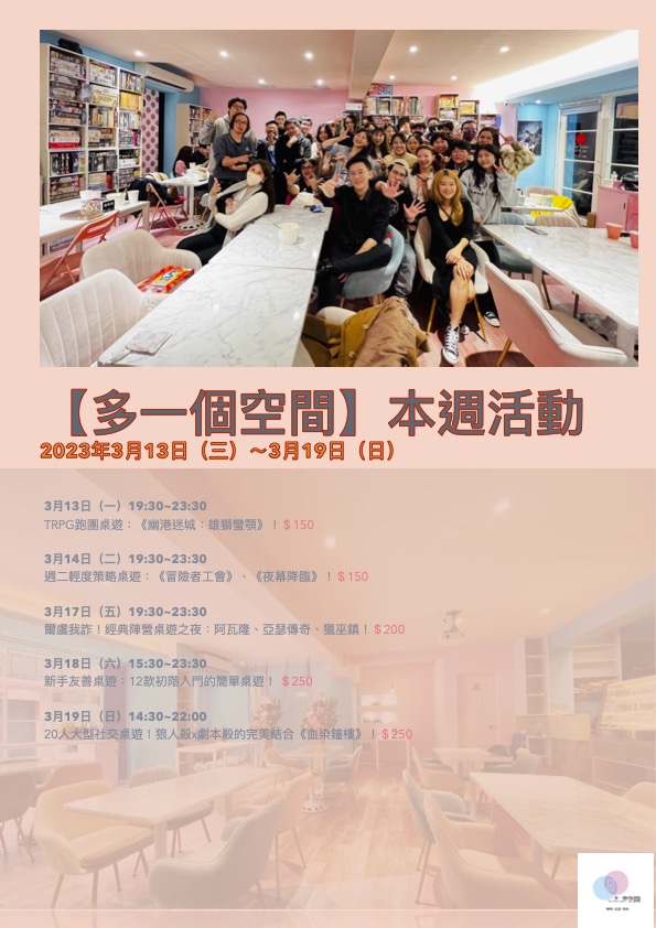 「多一個空間」由【多多看電影】的部落客-多多 所創立,一個致力於舉辦各種娛樂活動的場地,是一家複合式桌遊咖啡店,座落於龍山寺捷運站3號出口,視覺裝潢以馬卡龍粉與湖水藍為主要色調,與附近巷弄的古宅呈現極大的跳躍反差。