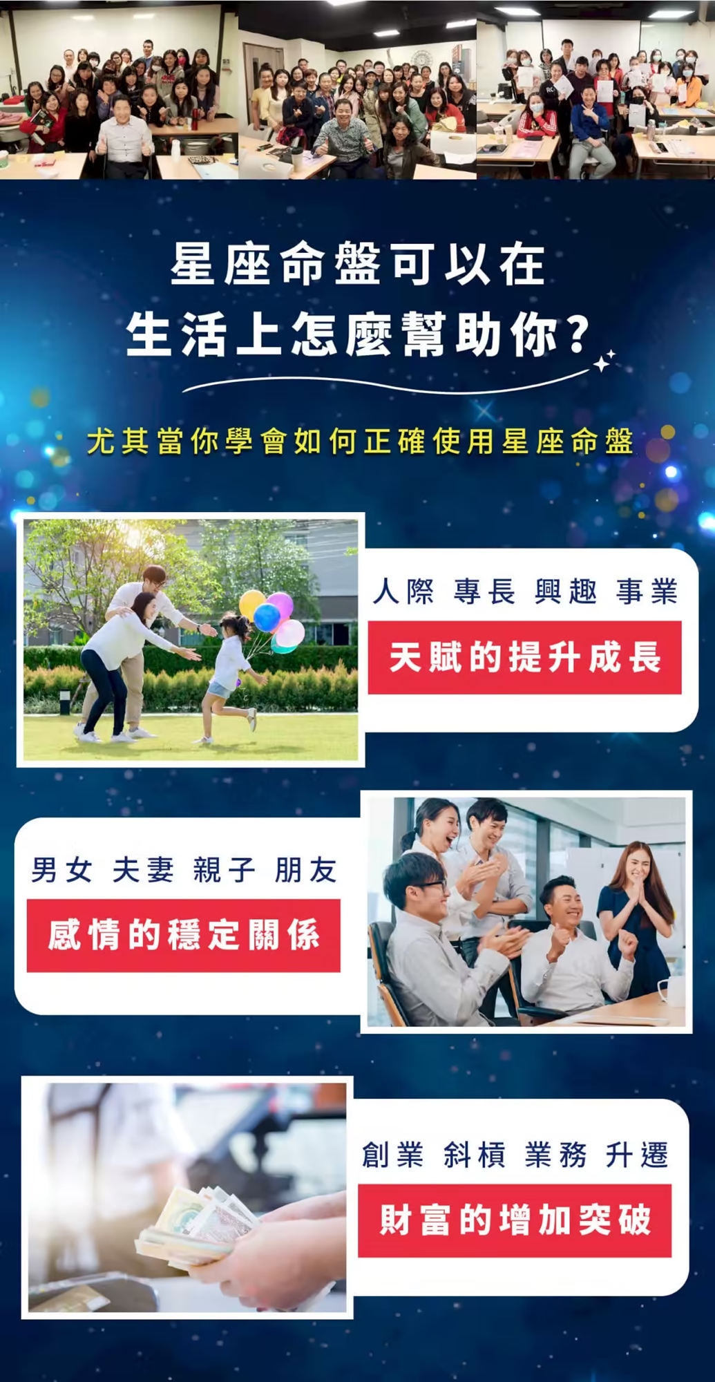 我擅長運用案主的星座命盤,尋找重要行星與特殊相位,將會引領你穿越時空,找出前世今生共同的人生課題,透過我的講座將可幫助你:脫離痛苦、追尋幸福