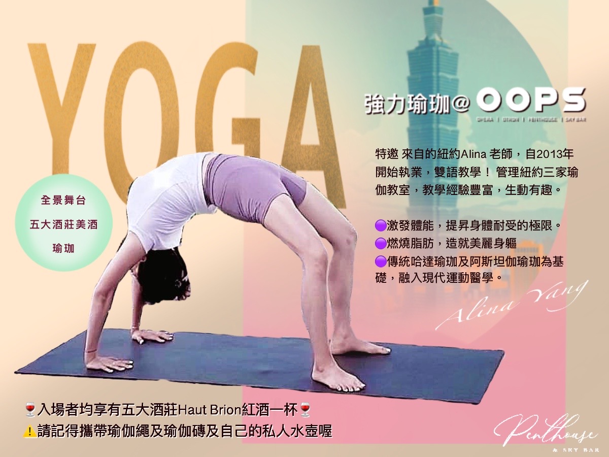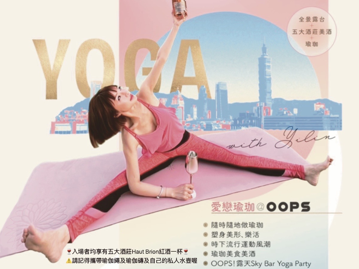 這次的香檳紅酒瑜珈活動會將在 OOPS 露天 SKY BAR 舉行,打造環形景觀之天空酒吧,讓您在城市中放鬆身心,享受人生片刻的美好,絕對是一個讓您度過難忘時光,並帶來獨一無二質感體驗的瑜珈派對。趕快加入我們,開啟健康美好的生活!