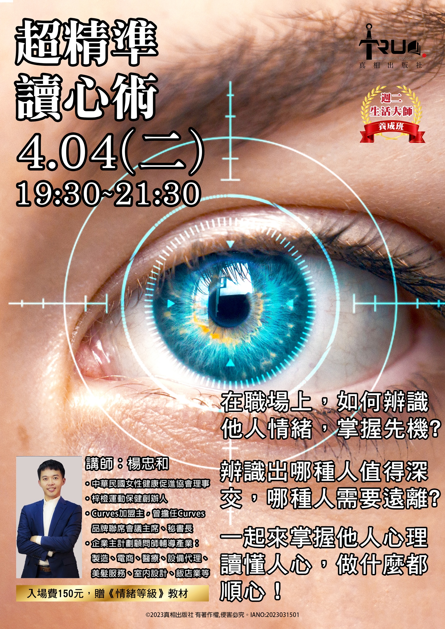 💪讀懂人心,做什麼都順心, 升級職場A咖必學讀心超能力!此講座教你如何觀察微表情、不錯放小動作,讓你暗箭易躲,免受騙.不再吃悶虧!為升職加薪好好鋪路!