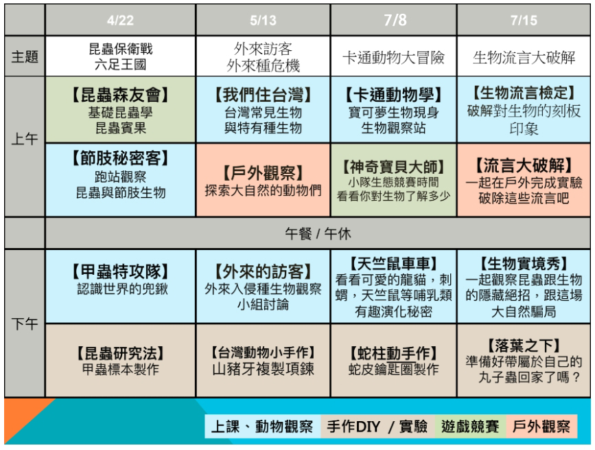 專業老師上課、動物觀察、手作實驗、遊戲競賽、戶外體驗