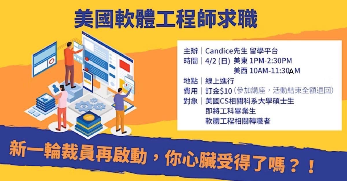 矽谷科技業裁員潮一波接一波,感覺各大執行長已經裁上癮了, 今年更是殺紅了眼, 導致數百名持有臨時簽證、在美工作的外國勞工,面臨被迫離開美國的風險, 你擔心害你會不會下一個被殺頭的人?亦或是即將畢業的你, 擔心受到這波科技業裁員煉獄的影響而找不到工作或實習呢?4/2(日)將由網路科技紅人矽谷資深女工程師 Lucy和資深工程師KS將分享自己成功案例和特殊小撇步, 讓你免於成為這波裁員潮的犧牲者, 成功逆轉勝!!!