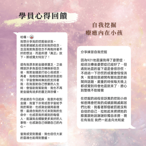 在這堂課中將會學習到一套完整的自我挖掘流程及挖掘技巧,學會完整的自我療癒。