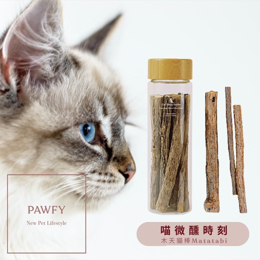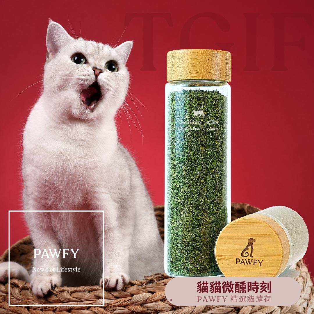 【喵微醺】是PAWFY普奧非的「貓系列商品」。產品皆為天然草本植物,包含貓薄荷、木天蓼等等變化出各式不同型態的貓用商品。適合一歲以上的貓咪使用。喵微醺系列產品用心製作,由農人於日出時摘取新鮮嫩葉後,採用職人揉捻技術及高溫殺菌、烘乾、再進行切片碎段,最後裝填入罐。