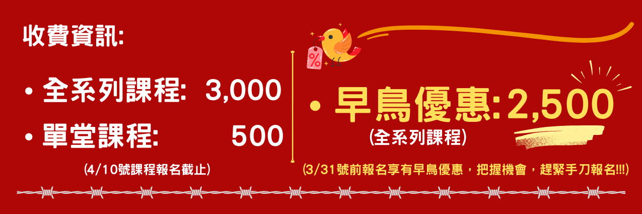 (4/13-5/9)課程13:30分開始報到,請各位學員及早報到,避免耽誤課程