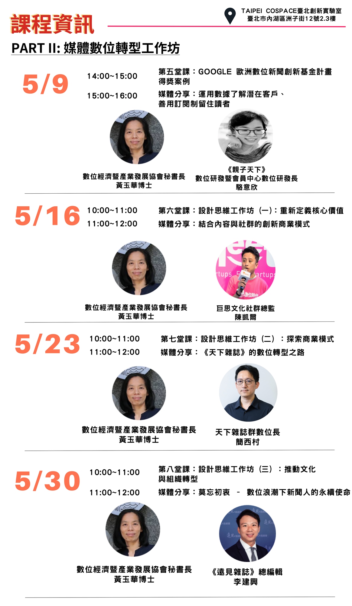 這八堂課特別邀請數位匯流的領先者聯合報集團、以數據驅動創新的天下雜誌、探索數位敘事可能的關鍵評論網、運用區塊鏈技術賦能創作者的Matters和讚賞公民基金會、支持創新社群創造價值的巨思文化以及抱持永續願景與新聞使命的遠見雜誌 — 因為這些媒體先行者,在迎向數位挑戰的過程中,都已分別走出自己的路。