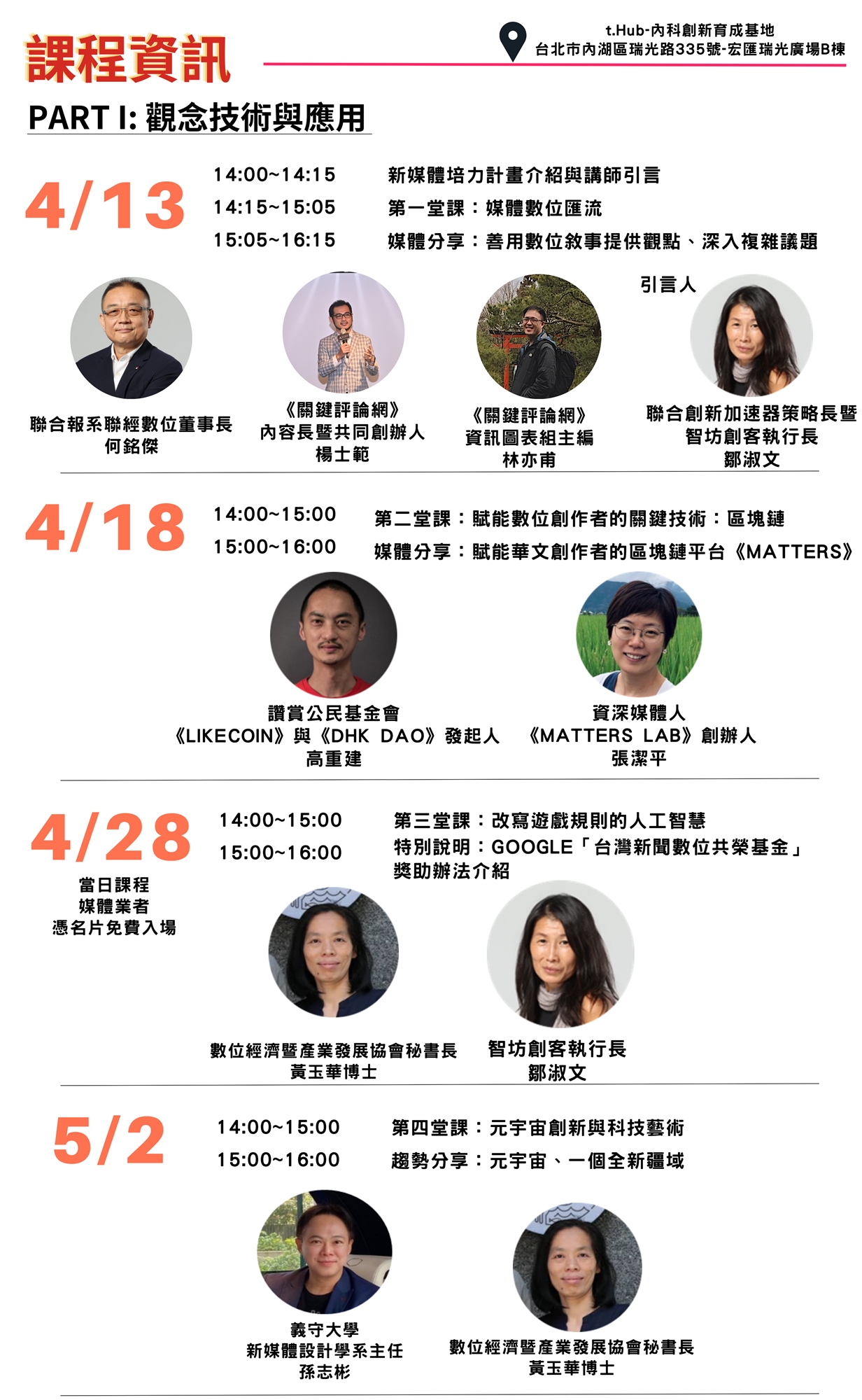 這八堂課針對重要數位科技區塊鏈、AI、元宇宙設計專業課程,規劃媒體數位轉型的設計思維工作坊,重新定義媒體的價值、探索可行的商業模式,以及繼之的文化改造與組織轉型。