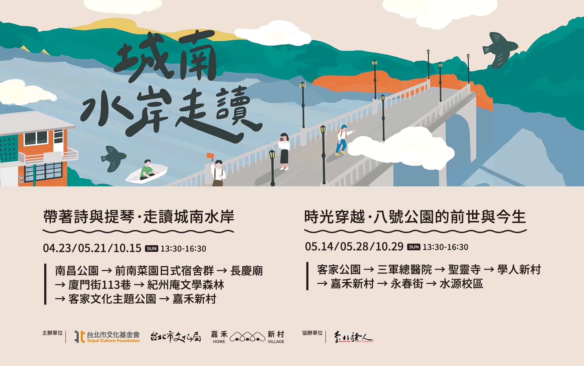 4/23(日) | 【帶著詩與提琴,走讀城南水岸】 | 南昌公園→前南菜園日式宿舍群→長慶廟→廈門街113巷→紀州庵文學森林→客家文化主題公園→嘉禾新村 週邊活動:寶藏巖光節、4月兒童節「城南有意思」 |