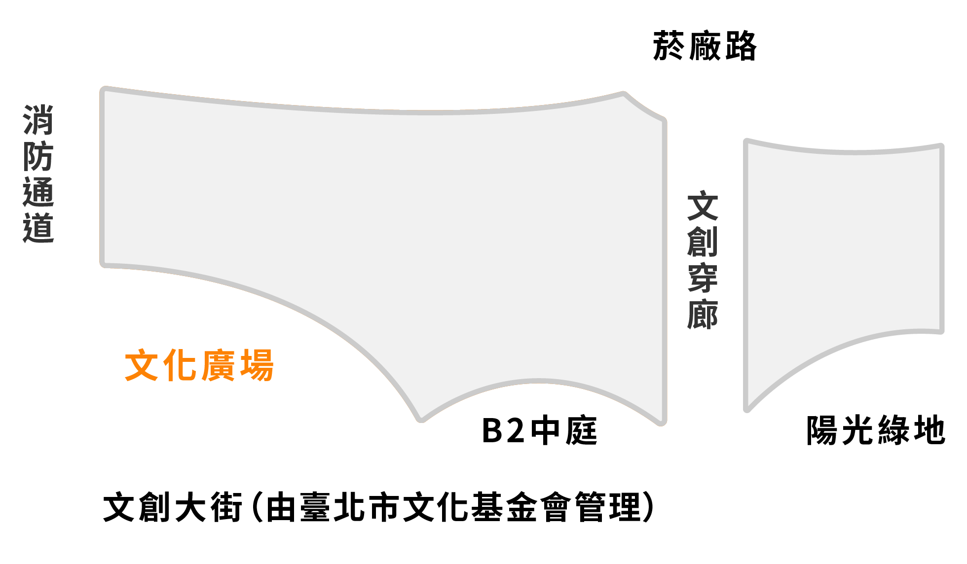 臺北:於臺北文創大樓戶外場域「文化廣場」(橘字區域),約佔地約350坪,請選擇廣場合適範圍進行規劃,場地介紹