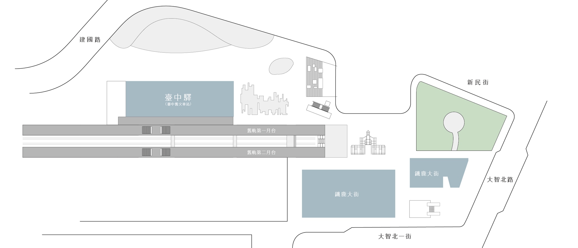 臺中:於臺中驛鐵道文化園區內,下方圖面示意綠色色塊位置(佔地約700坪),請選擇合適範園進行規劃,場地照片請至雲端連結 https://lihi3.cc/BGwJS 觀看。
