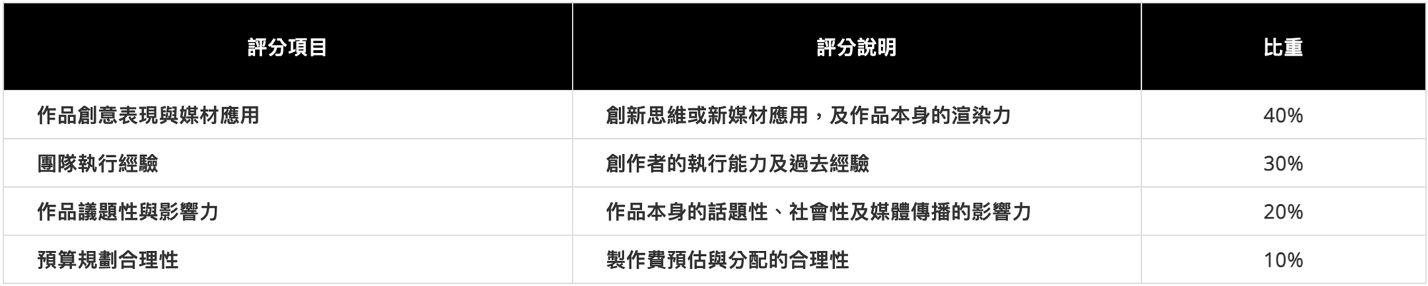 徵件組別:依製作經費規模,分成「潛力新銳組(120萬製作費)」、「實驗新秀組(60萬製作費)」兩組。