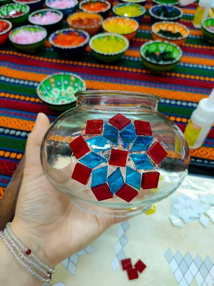 Enjoy making a traditional Turkish lamp that lighten your room with your family, couples or friends Create an everlasting gift for your loved ones with your own creativity or design samples while no experience or prior knowledge required. Enlighten your nights with the traditional Turkish lamp that you build piece by piece by using 12 colors of different shaped hand-cut glasses and beads.