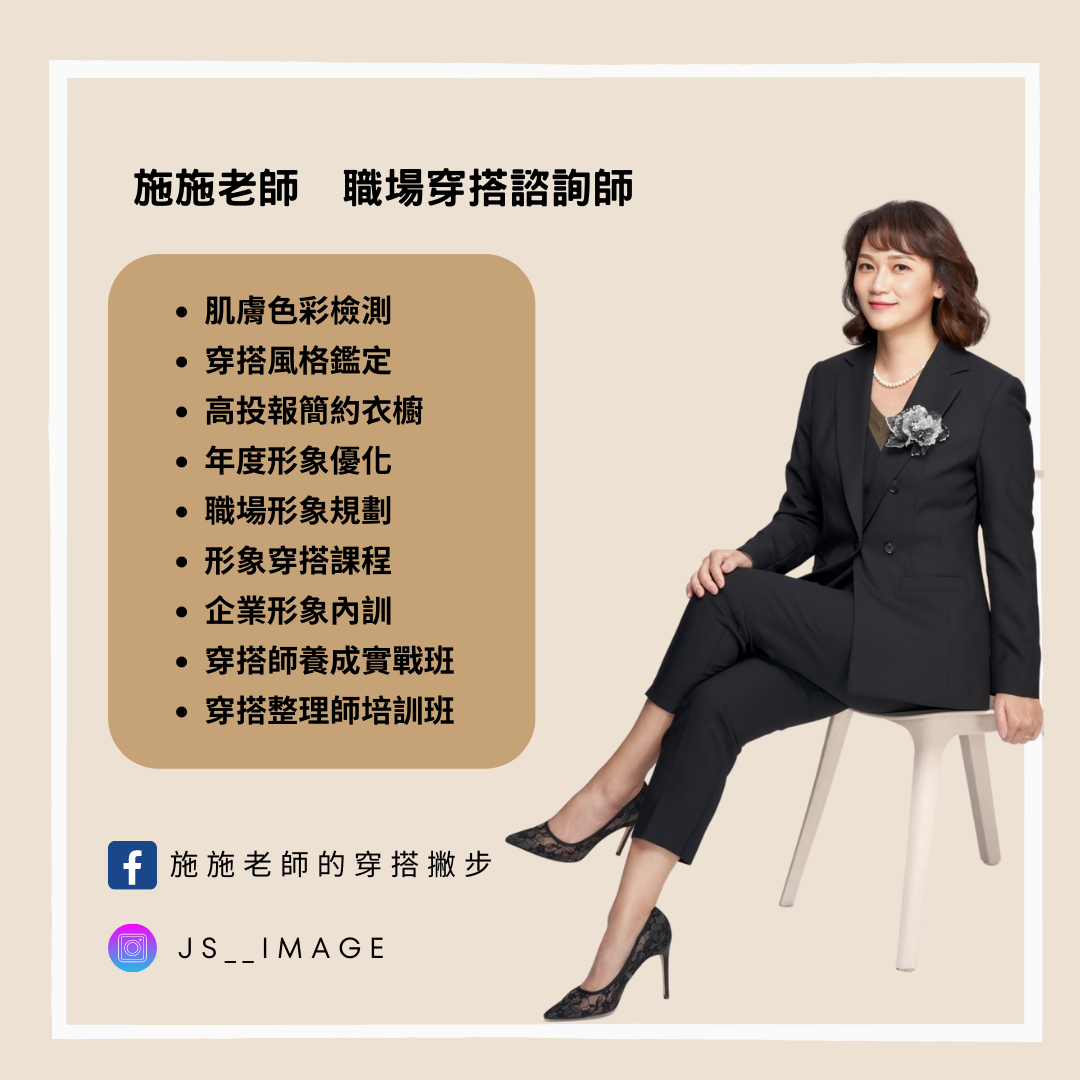 - 專長講題:形象管理、穿搭技術、色彩搭配、職場穿搭、女人價值、自我成長、情緒等級