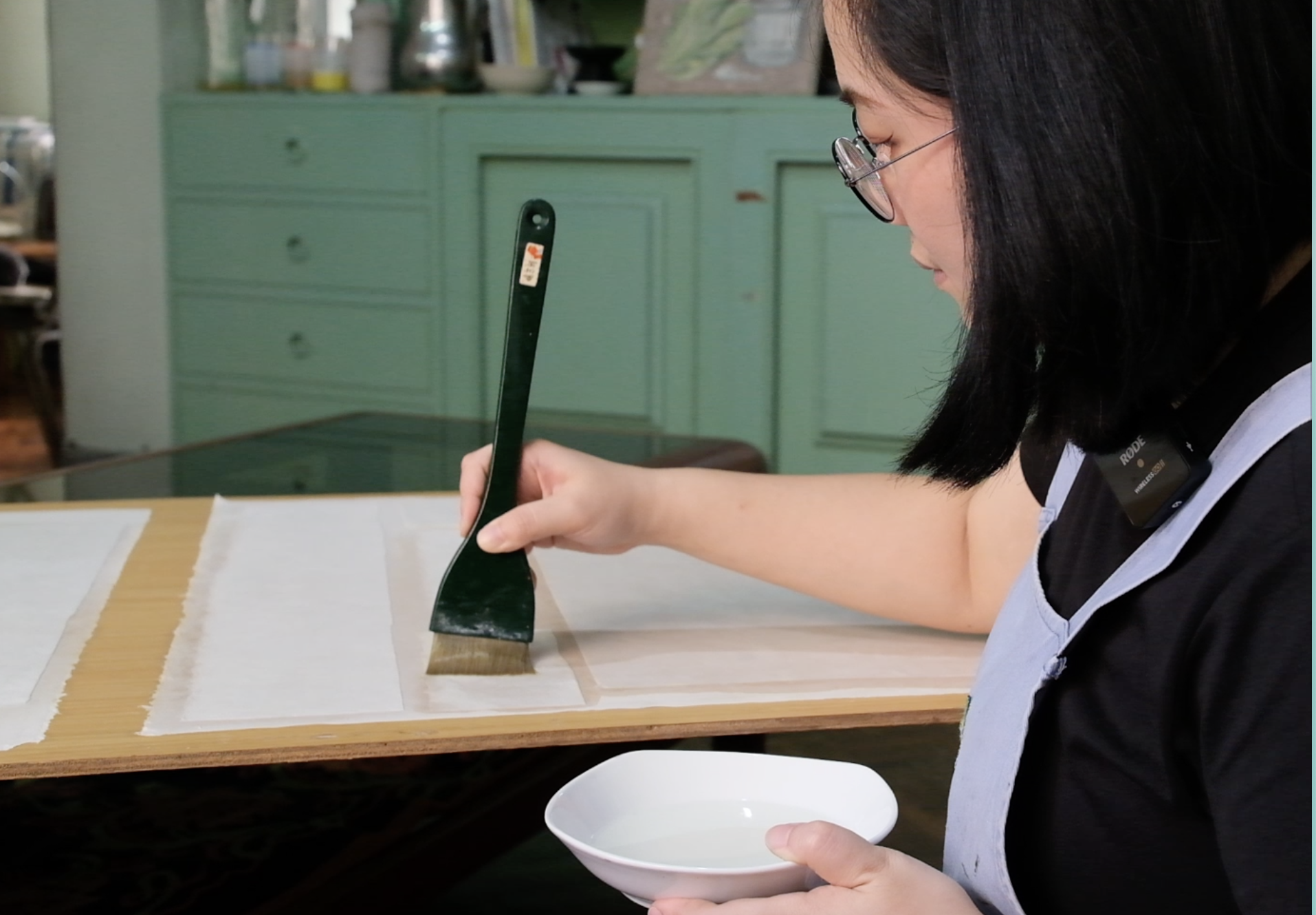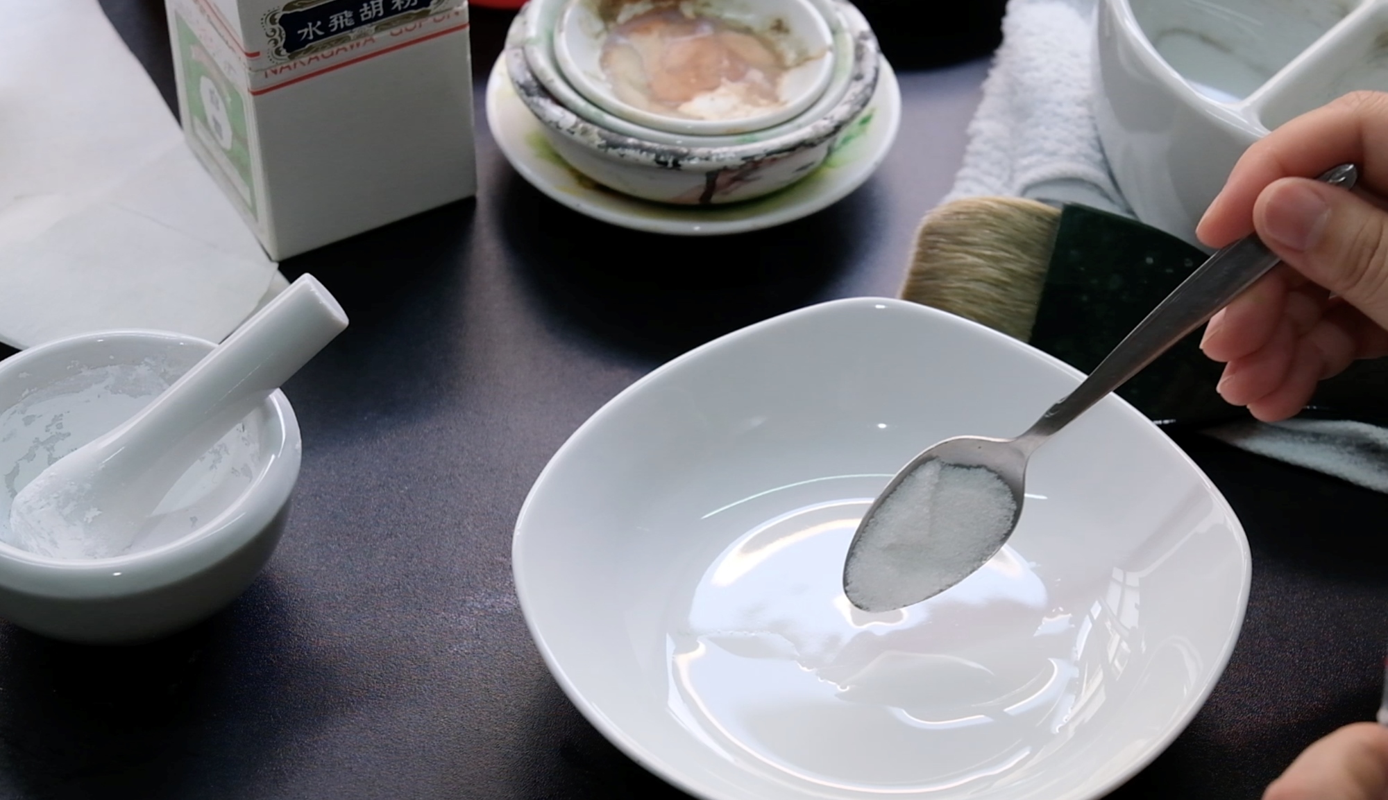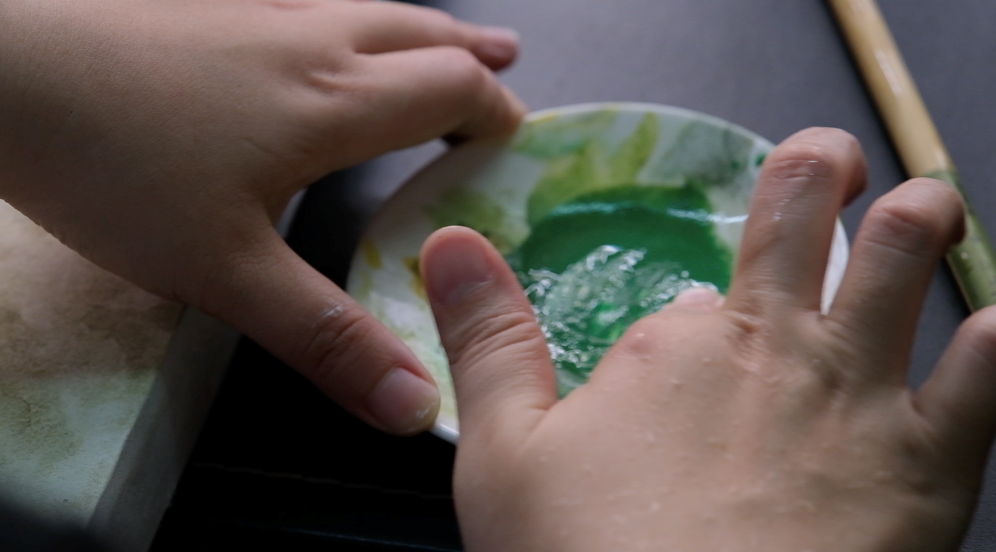 她一匙一匙舀入膠水,將顏料粉末摻入碗碟中,再用指尖輕輕攪拌融合它們。在這裡撒些粉末,在那裡加幾匙的調色動作,跟下廚很相似,只差在顏料不可食。