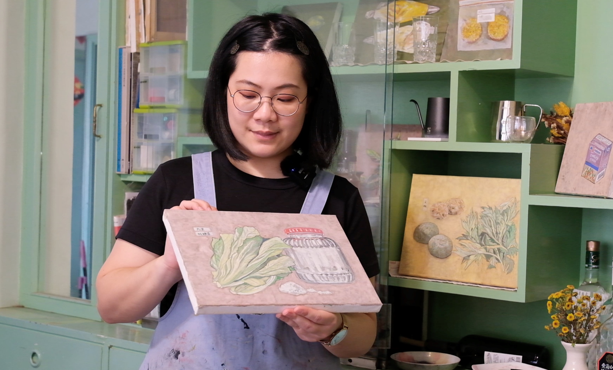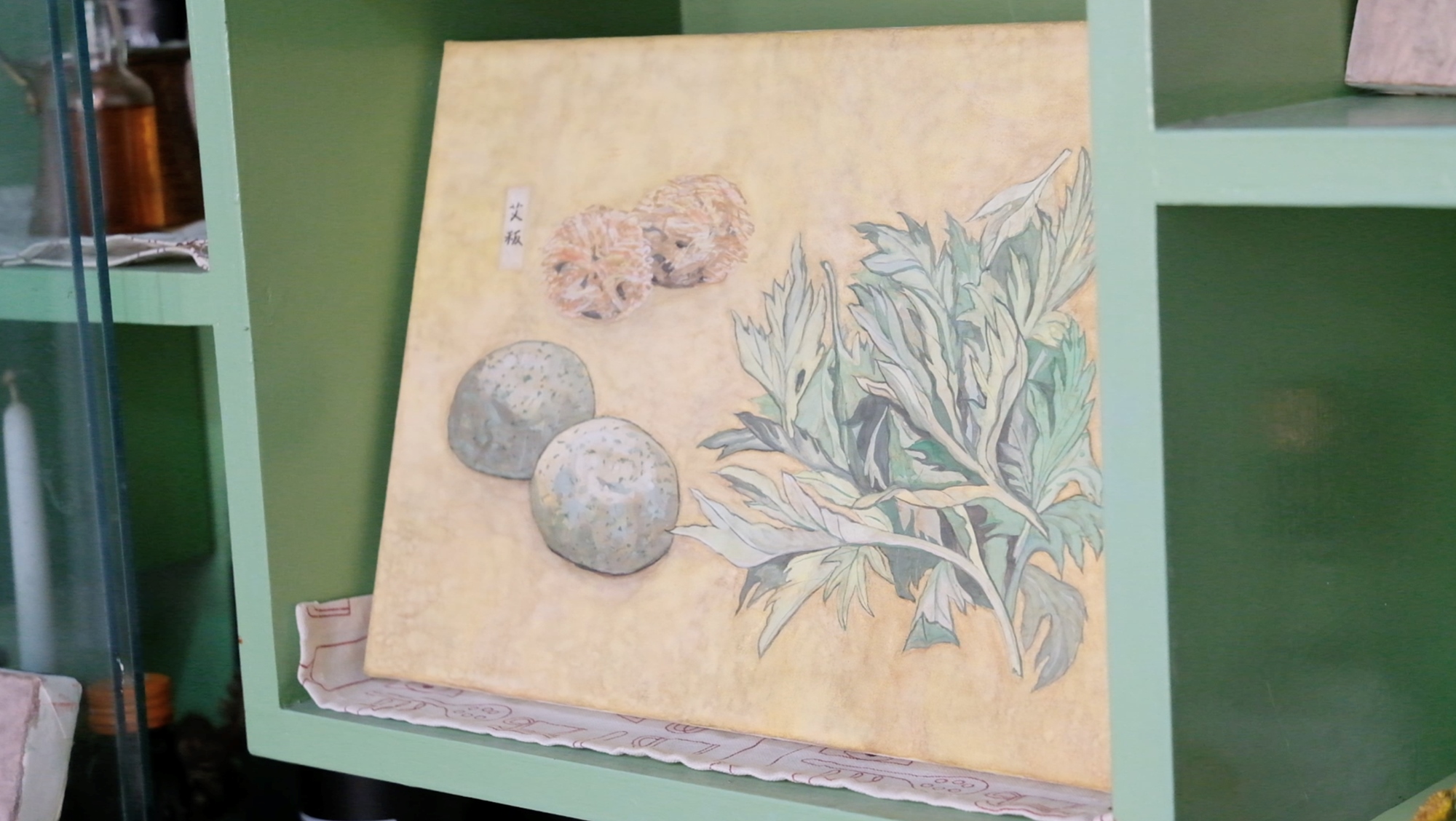 膠彩顏料富有多種與日常生活連結的色彩,比如:白茶、松葉青、珊瑚末,或小豆茶。延伸彼時顏料命名者對生活色彩的觀察,志雅用膠彩為媒介,與你分享她所喜愛的餐桌風味,是客家艾草粄的綠色、紅豆餡的豆沙色、桔醬的橘黃色、粢粑淡淡的米色,魚香茄子的紫色,又或者是川菜宮保雞丁辣醬的濃郁紅色,蒼蠅頭的韭菜綠、台式滷肉飯醬汁的深焦糖褐色……