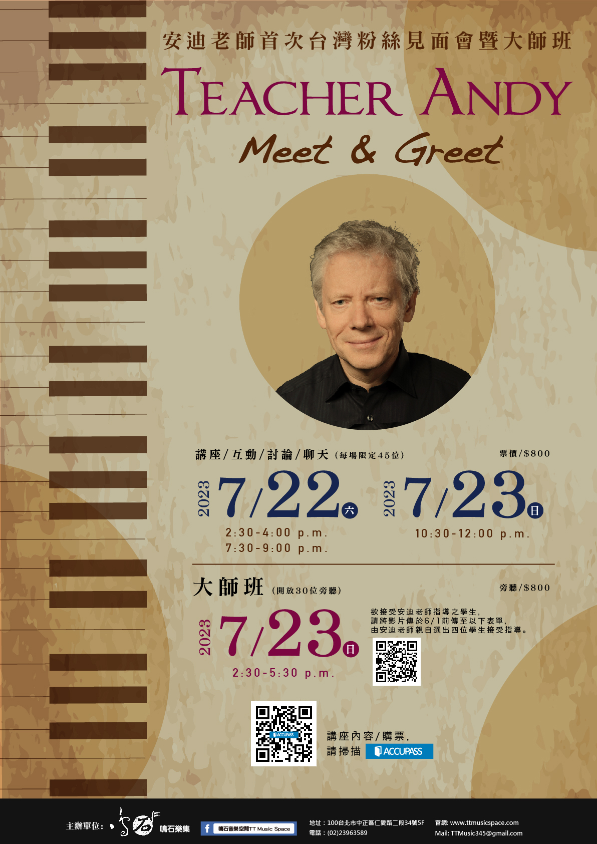 這次將為首次安迪老師與粉絲面對面,互動,討論,聊天,並舉辦鋼琴大師班。