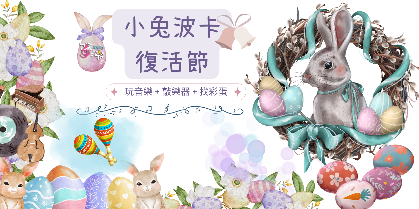 快樂外向的小兔波卡, 最喜歡聽著雨天的滴搭聲~今天來找咕咕雞,玩起來復活節的小遊戲, 現場音樂表演互動