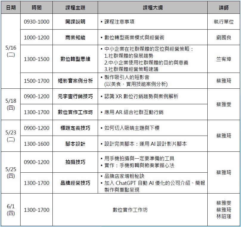 授課日期:05/16(二)、05/18(四)、05/23(二)、05/25(四)、6/1(四)