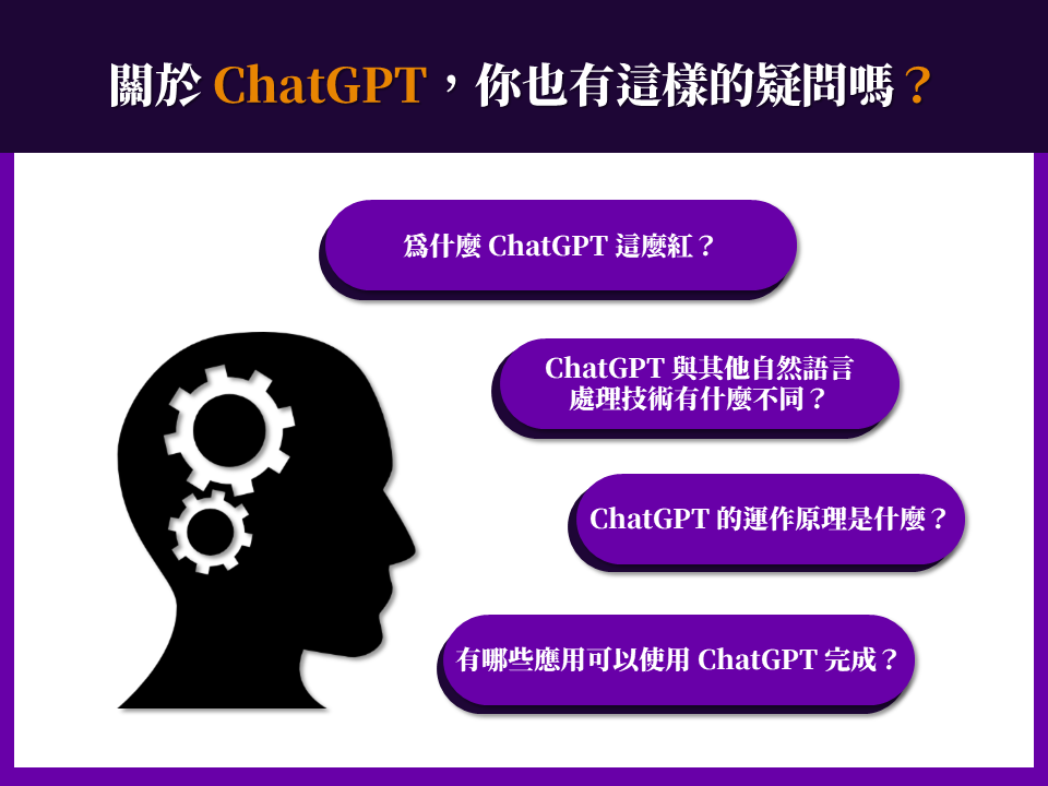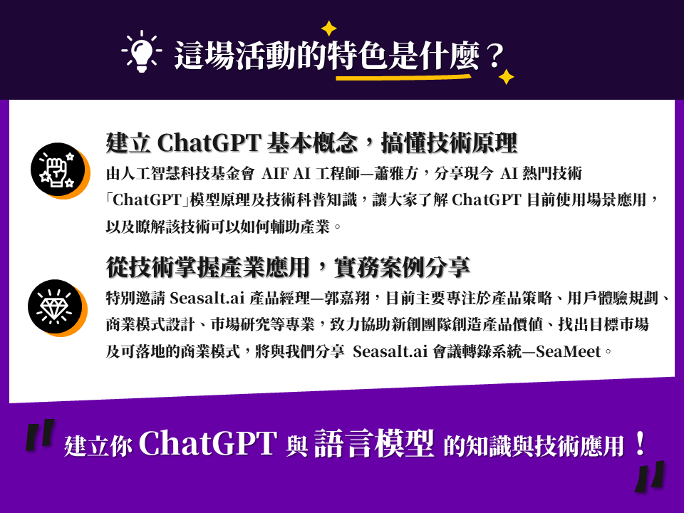 震驚全世界的 ChatGPT 快速竄紅,達成兩個月收割兩億用戶的成就,透過 AI 工具生成,僅僅需要幾秒鐘即可產出文案內容;本議題將和大家分享近期熱門討論的 ChatGPT 是如何做出其成效,並解析背後的技術概念及原理,有哪些應用也搭上了 ChatGPT 的熱潮?可以如何輔助產業應用?我們將在本次活動與您分享探究。
