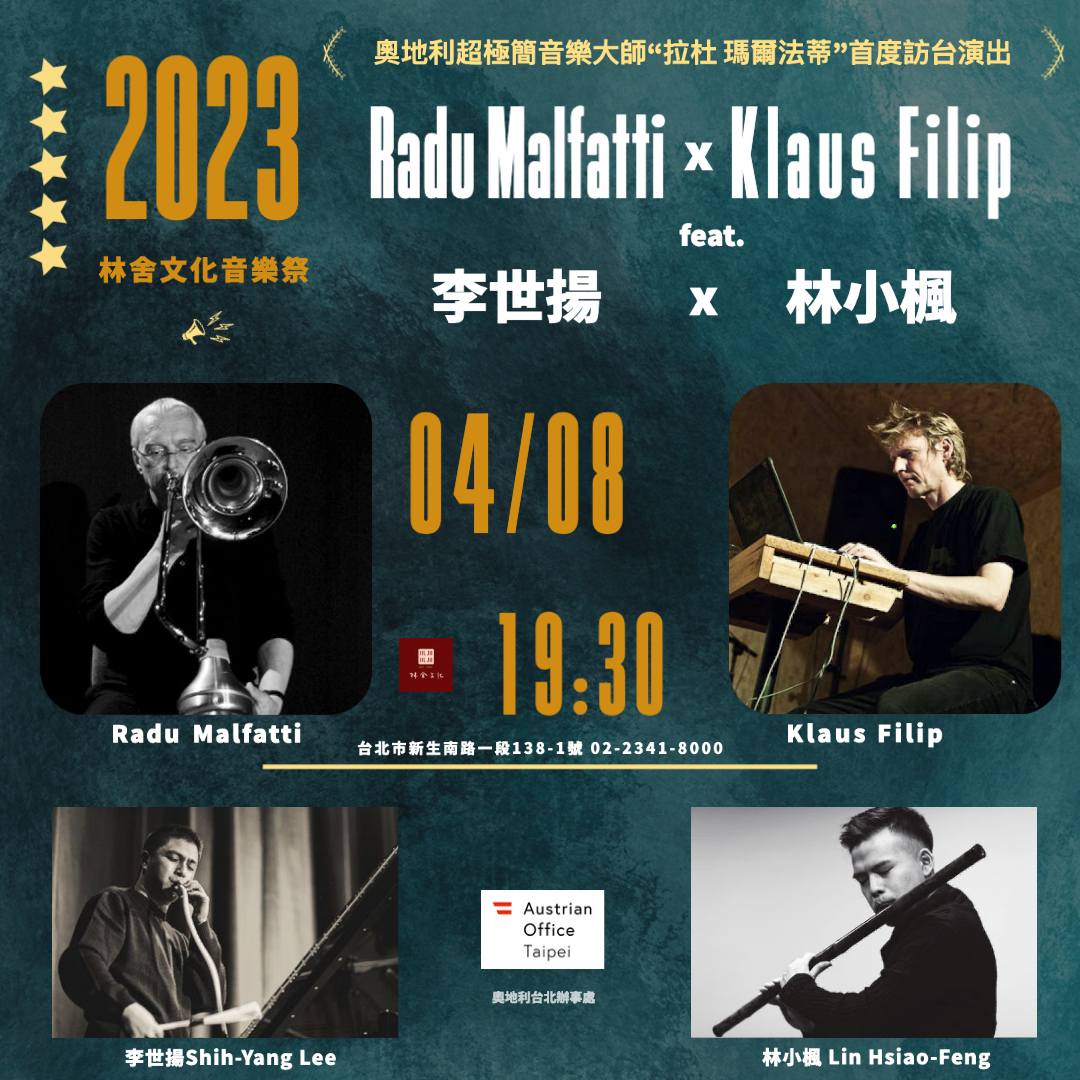 2023『林舍文化音樂祭』最終回-『極簡主義的邊緣』,首度邀請來自奧地利的極簡音樂大師“拉杜 瑪爾法蒂Radu Malfatti ,與極簡實驗電子音樂家克勞斯·菲利普Klaus Filip兩位多年合作的音樂家,與台灣即興鋼琴鬼才李世揚、笛樂家林小楓共同演出。