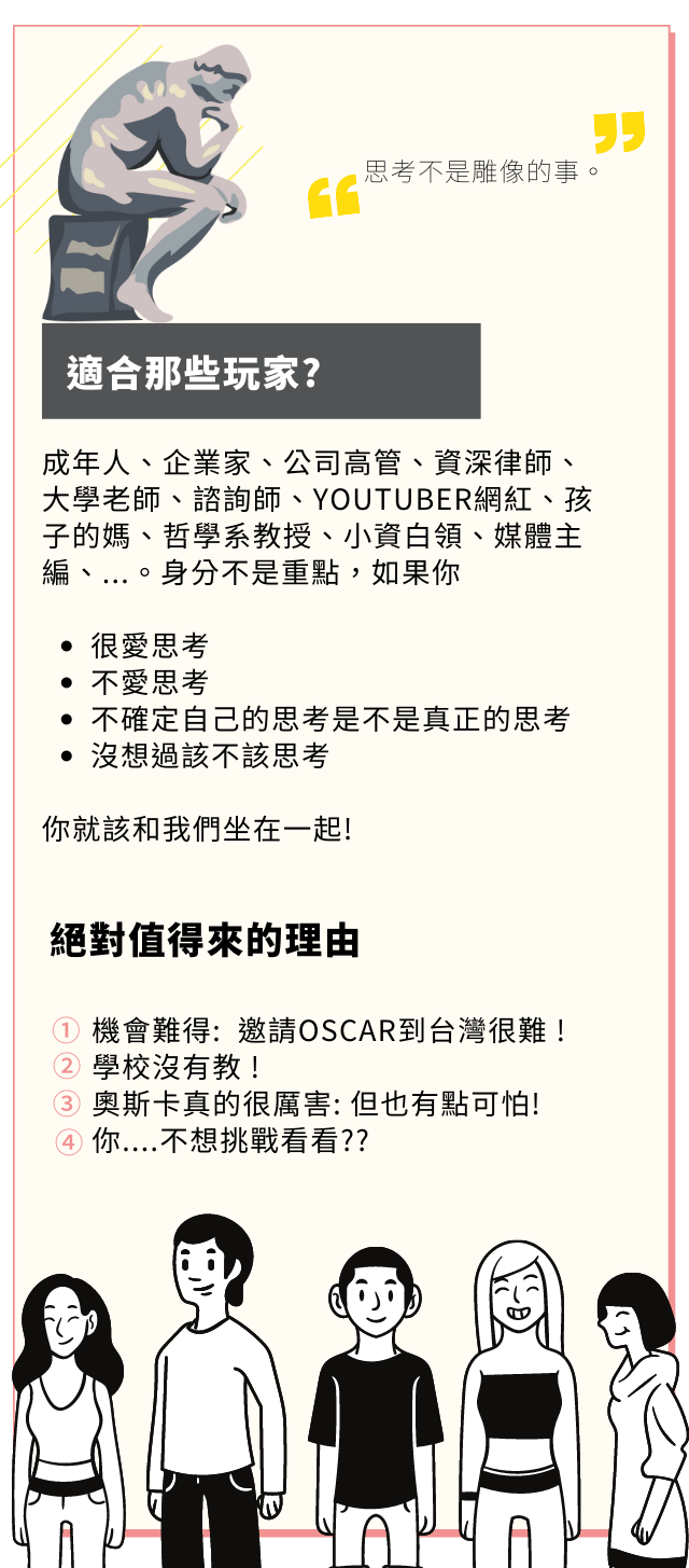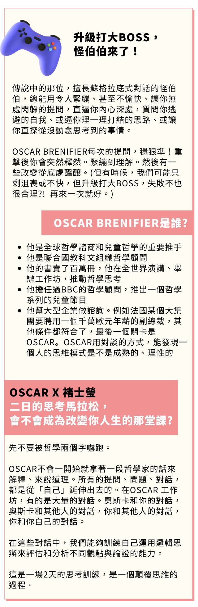 ◎ 語言: Oscar Brenifier以英文進行,主持人褚士瑩先生現場協助翻譯