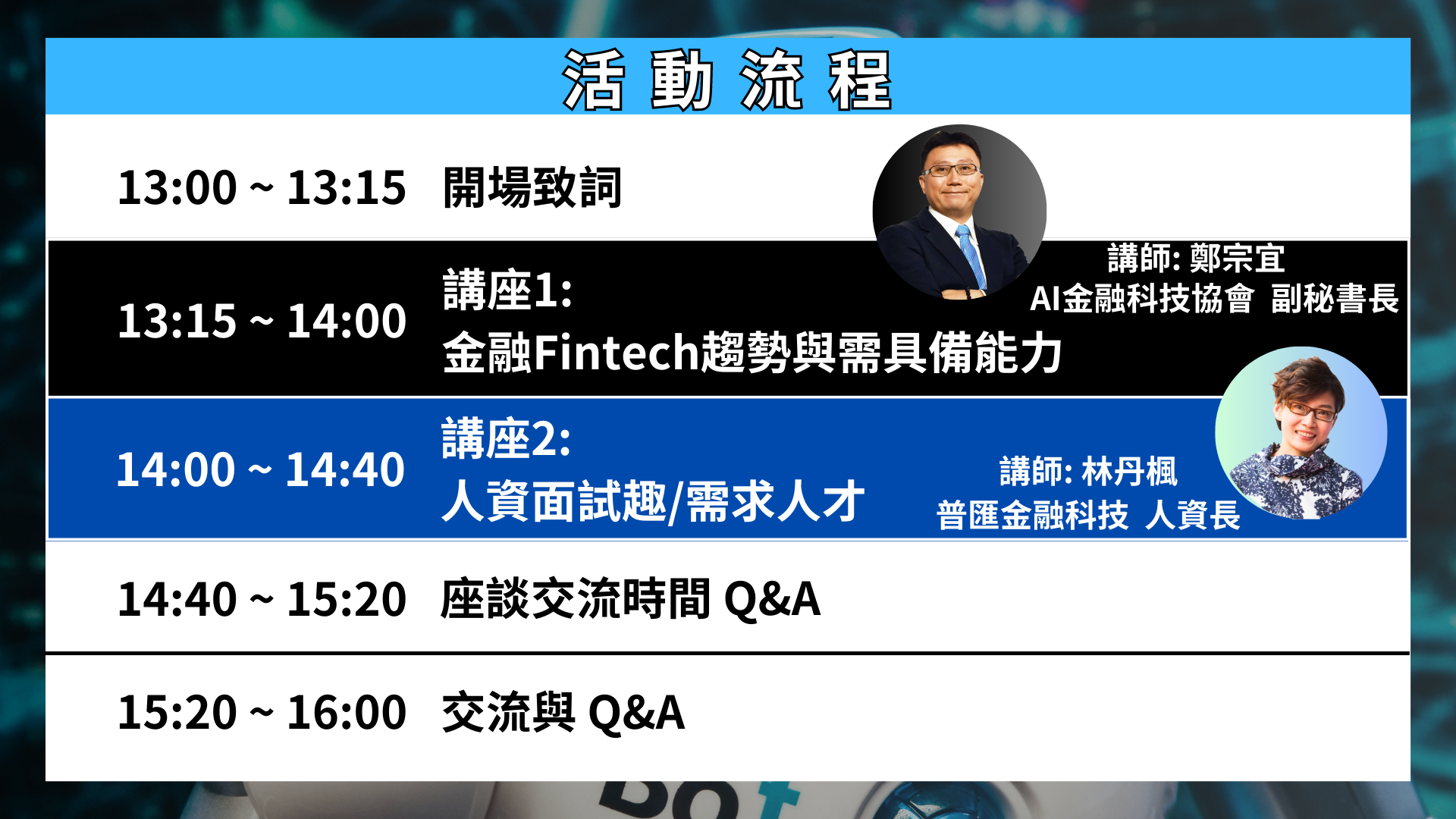 榮幸邀請「AI金融科技協會 副秘書長-鄭宗宜」和「普匯金融科技 人資長-林丹楓」擔任我們這次講座的講師,他們兩位皆是在金融科技領域的專家,而我們今天要來探討在這個AI為主流的時代,究竟成為Fintech人才需要具備什麼能力,二位講師將會透過專業的知識和職場多年的經驗,告訴各位答案是什麼!