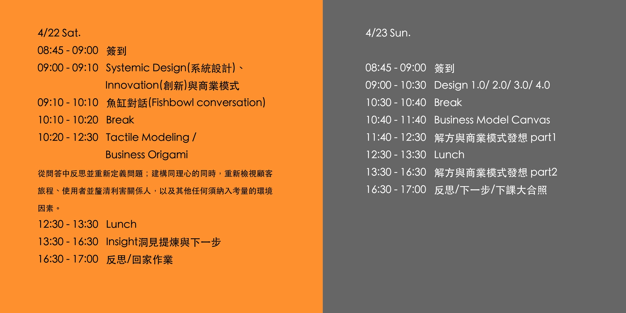 如果你對設計思考有興趣,如果你對循環經濟、商業模式與創業有興趣,如果你想了解「系統創新」的思維方式如何幫助人們打造更健康、更明亮的未來,在科技、人、環境、商業找到發揮最大價值與正向影響力的甜蜜點,你需要立刻報名!在兩天的工作坊中,除了立基於設計思考的原則,也會圍繞系統創新的方法論,針對團隊不同的進度,提供相對應的需求、輔導與下一步建議。