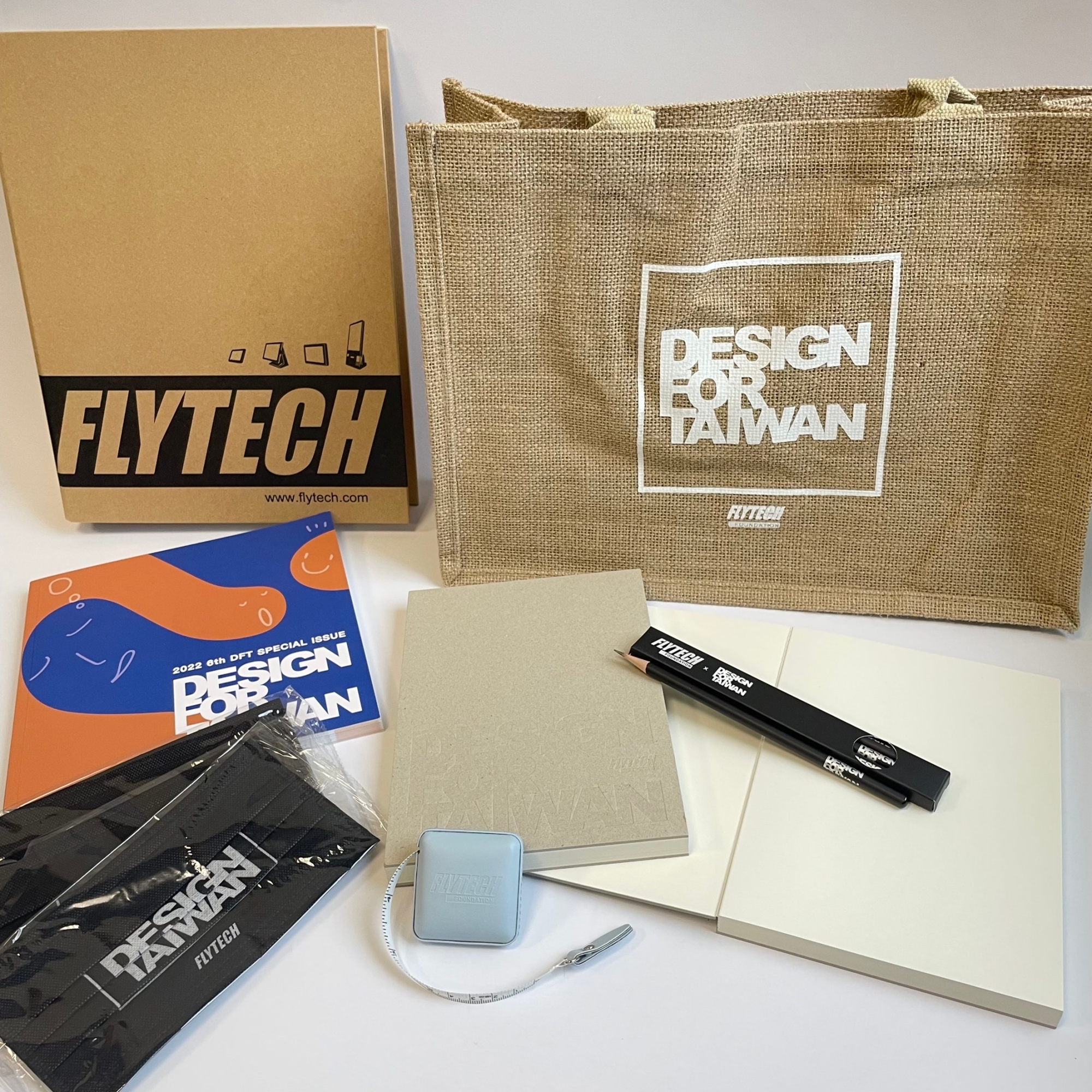 DFT禮品:麻布袋、牛皮檔案夾、筆記本、口罩、捲尺、鉛筆三入組、專刊(DFT社會設計展各組專案設計精華)。