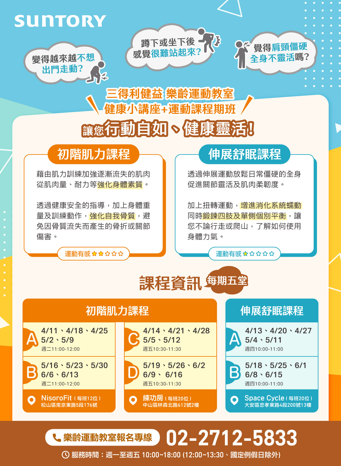 三得利運動教室規劃健康小講座加上運動課程期班,雙管齊下支援日常生活,讓您行動自如、健康靈活!