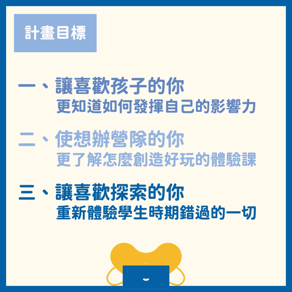 好棒!真希望國中時的我能有這樣的機會接觸這樣的營隊,帶領著引導著去好好探索自己想要的是什麼、想成為的樣子是什麼、不喜歡的又是什麼!謝謝有這麼一群人做著這樣一件很有意義的事,教導課堂上不會有的深刻體驗和自我探索!你們真的很棒!如果有機會也想參與成為你們的一員。