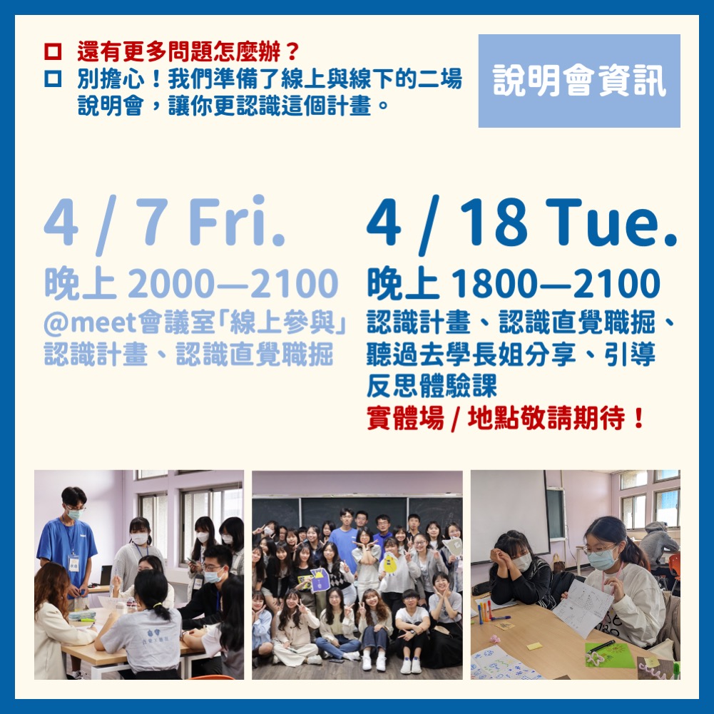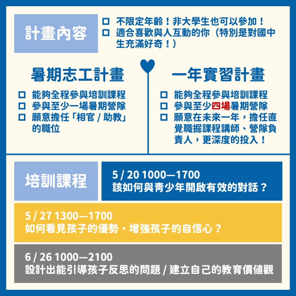 不止有暑期的志工,也有一年的「實習陪跑計劃」,讓參與營隊完、對國中生燃起濃濃好奇心的你妳,有更多上台授課、甚至是成為營隊主持人、和直覺職掘的夥伴一起辦營隊的機會。