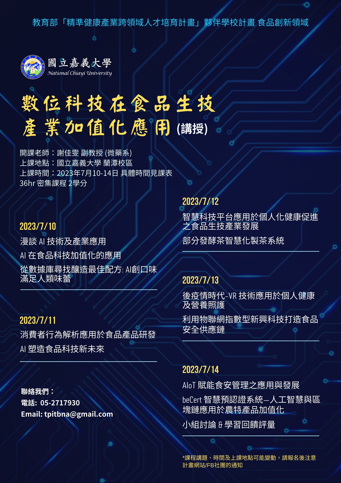 本課程為國立嘉義大學生命科學院執行教育部「精準健康產業跨領域人才培育計畫」夥伴學校計畫 所開設專業講授課程。