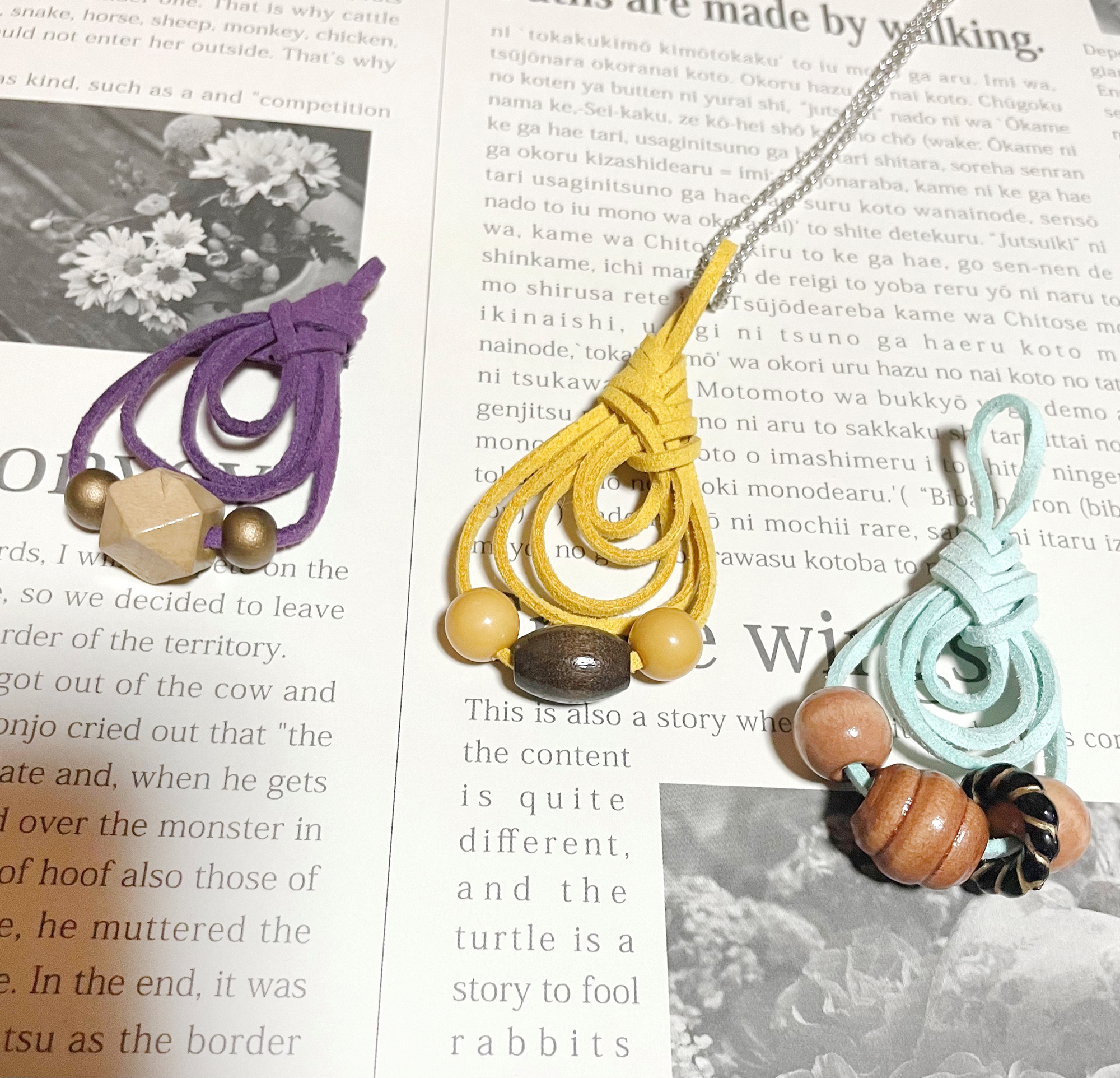 皮繩琵琶結項鍊: 使用彩色皮繩編織在日本稱為みょうが結び( myoga 結)形狀的編織吊飾,將完成的吊飾裝上扣具及鍊子來完成作品。