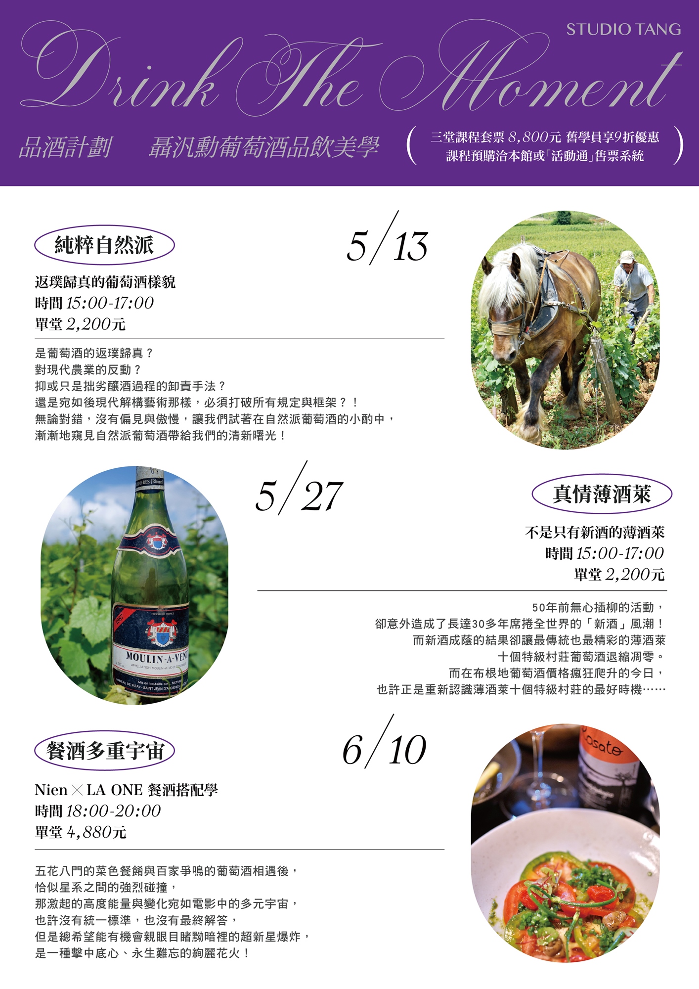 2023年大唐塾〈品酒計劃〉,講師聶汎勳將從全新角度帶我們認識「自然酒、薄酒萊、餐酒搭配學」,在氣味系統與味蕾經驗不斷被啟發的過程中,獲得全身心的滿足。