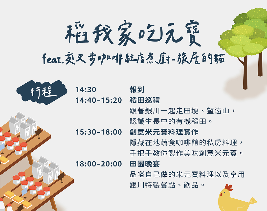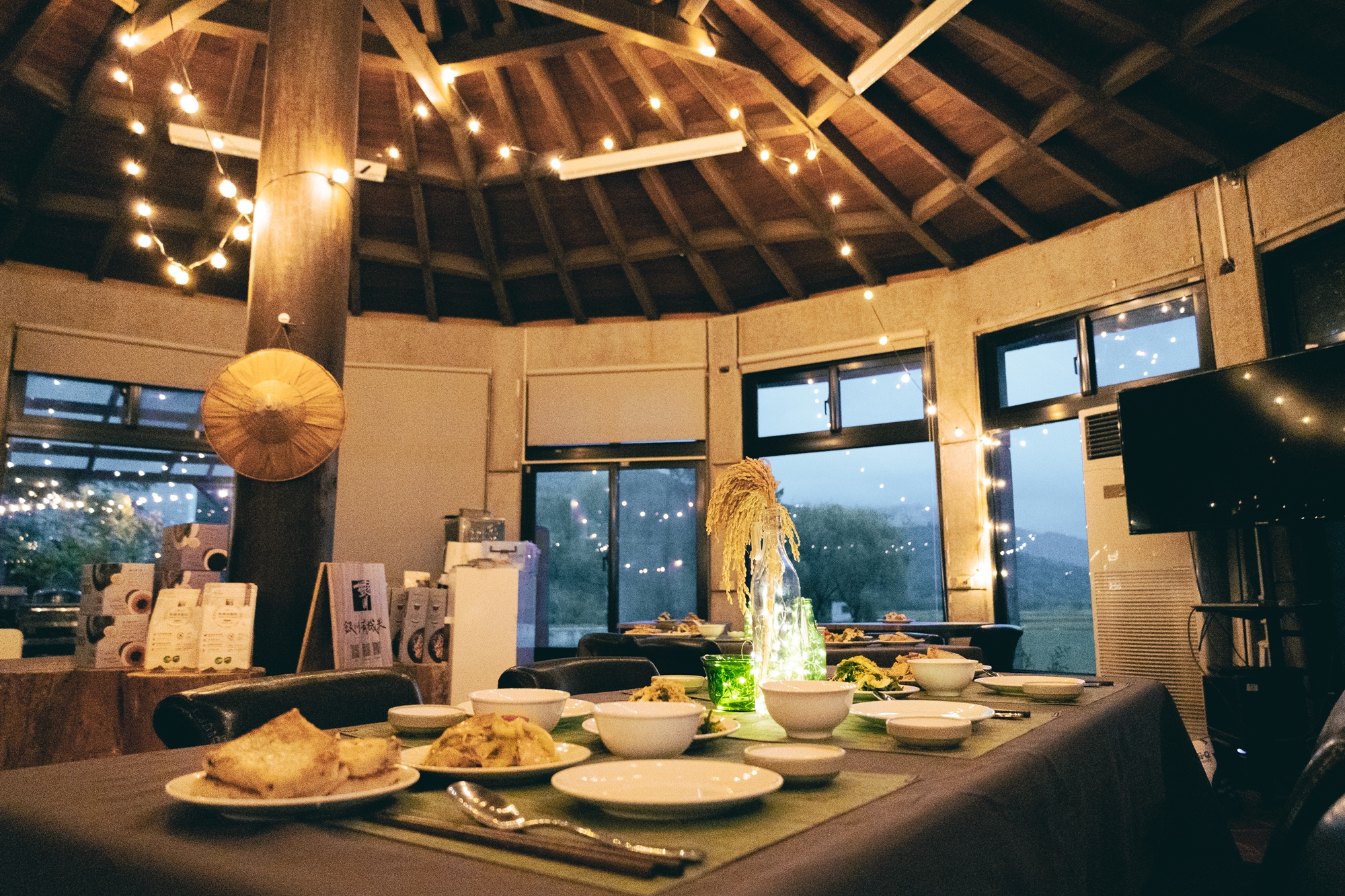 除享用自己製作的米元寶外,還有煮廚的私房料理、飲品招待,坐在特製的米糠懶骨頭上,望遠山、享美食,與親友同度療癒又放鬆的晚餐時光。