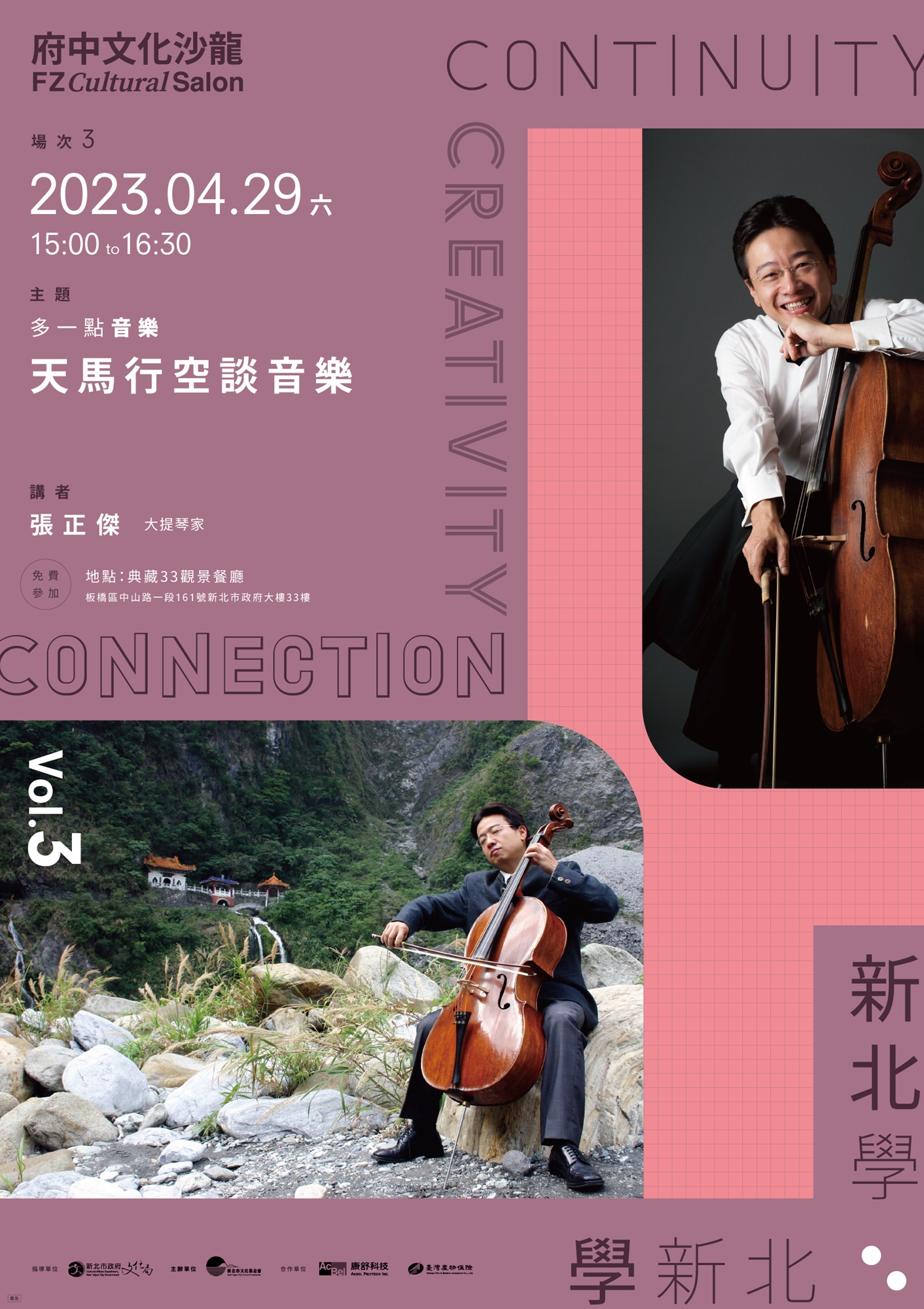 2023府中文化沙龍第三場,由表演場場秒殺的張正傑主講,將在新北市府大樓的典藏33景觀餐廳登場。一起聆聽張正傑的分享,從他的天馬行空,讓日常的音樂多一點,創意多一些,美好無限!