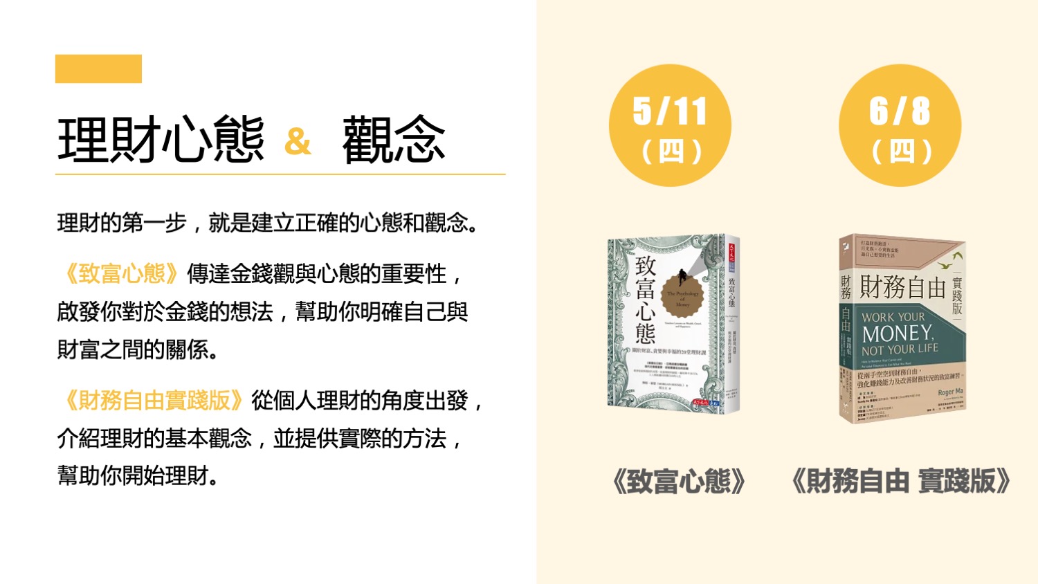 - 加碼實作工作坊:透過工作坊的帶領,解決你在執行理財時所遇到的問題