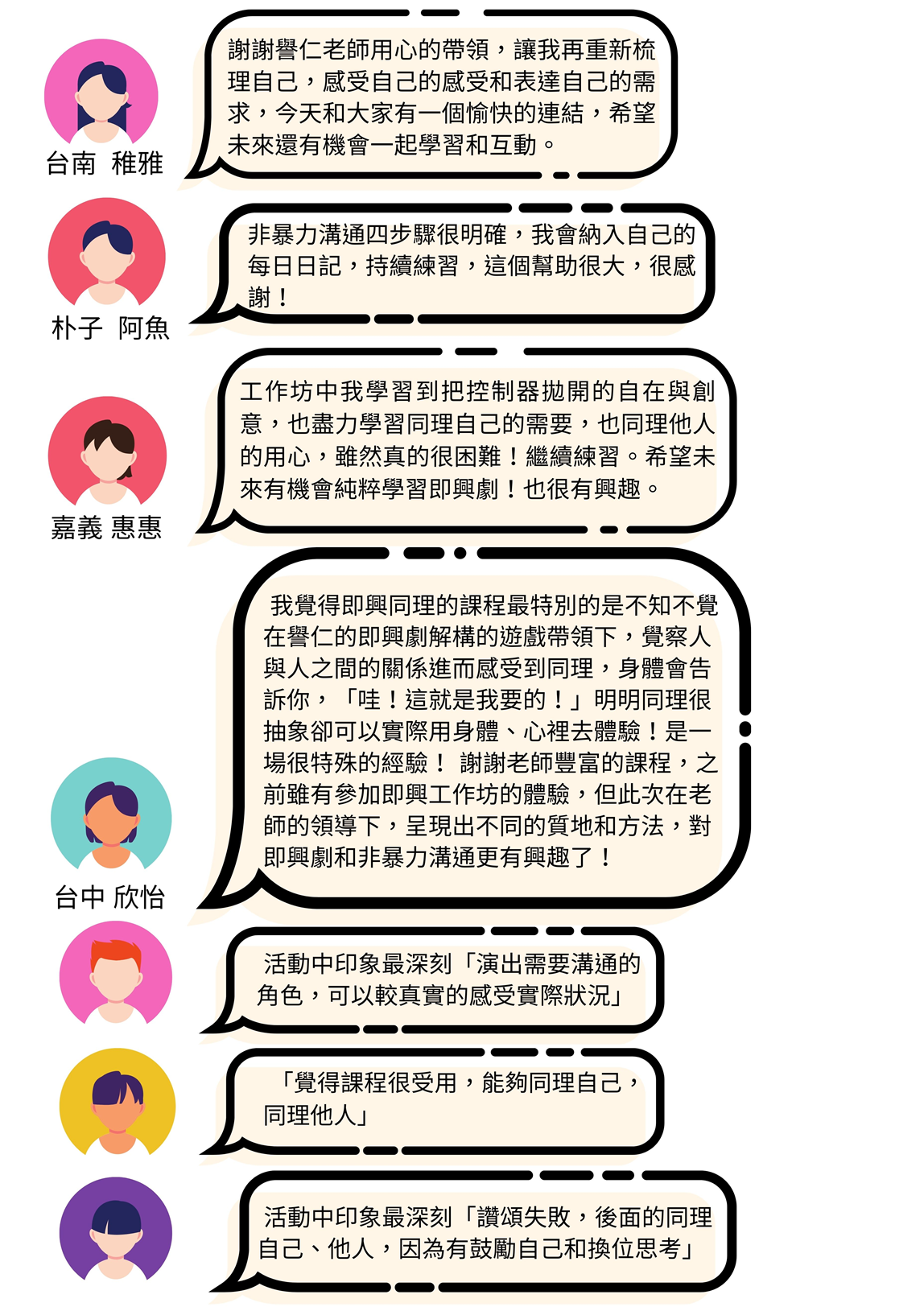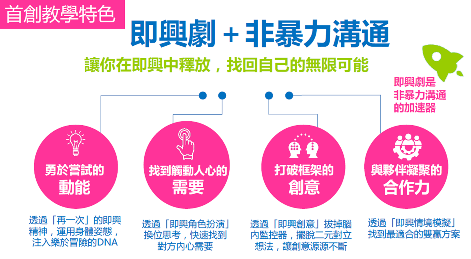 「再難搞的對象,你也能愉快溝通的秘訣」體驗工作坊,結合“即興劇IMPROV ”+“非暴力溝通NVC”手法,這堂課能讓你學到如何展現「彈性」及 發揮「同理」: