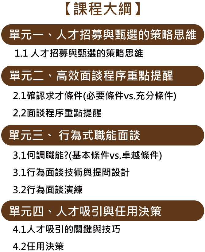 本課程將教授您高效面談程序的重點提醒,以及行為式職能面談的技巧,進一步幫助您招募到最適合的人才。除此之外,我們還將探討人才吸引和任用決策,讓您在人才管理方面更加得心應手!